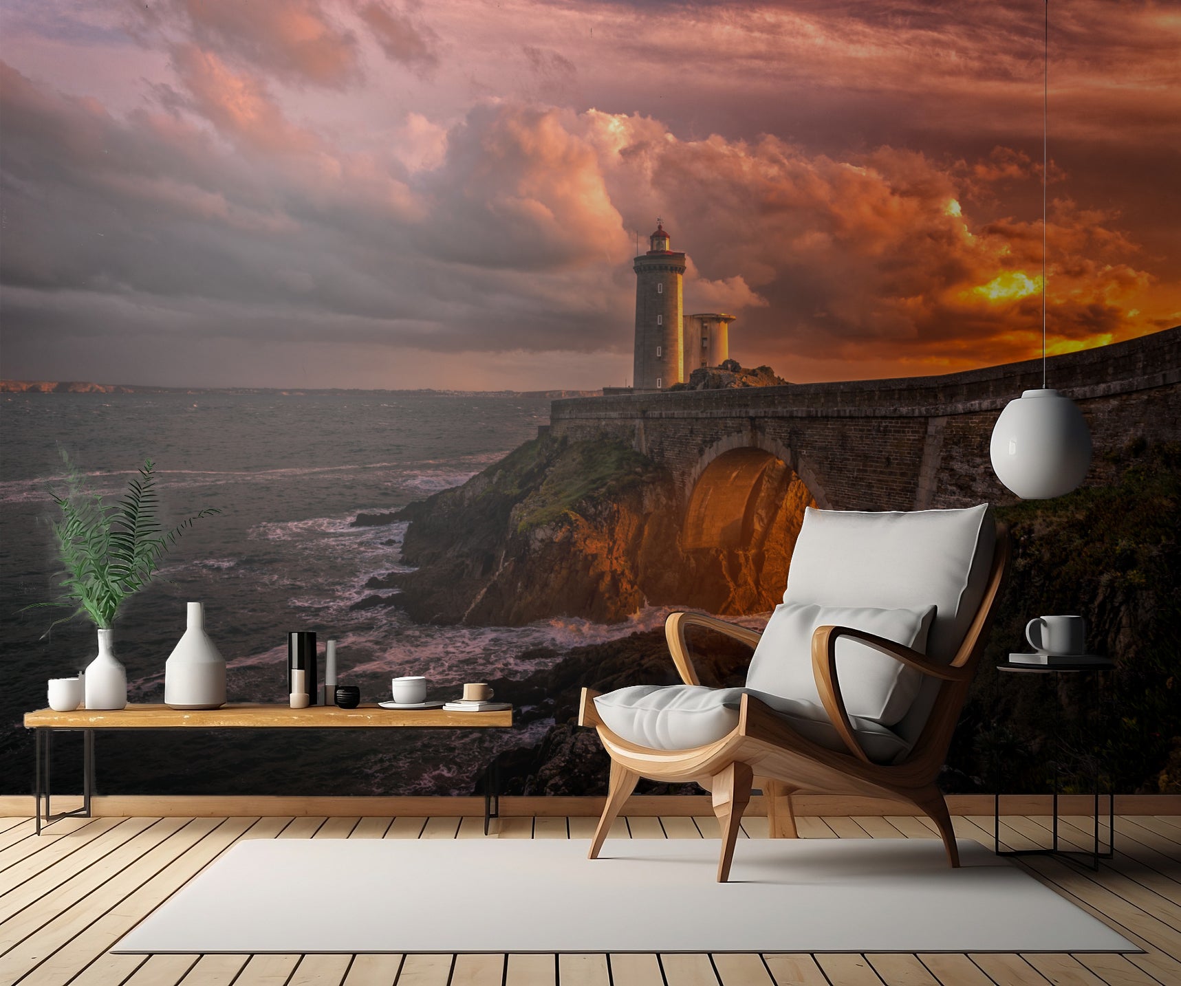 Med väggtapeten "Sun is Down" tar skaparen Denis dig med på en magisk resa till den franska kusten i Brittany. Landskapet är fyllt av dramatiska moln, glittrande hav och en vacker solnedgång som kastar ett gyllene sken över allt i sin väg. En majestätisk fyr lyser upp horisonten med sitt karakteristiska torn, medan en bro leder dig över det lugna havet mot avlägsna äventyr.