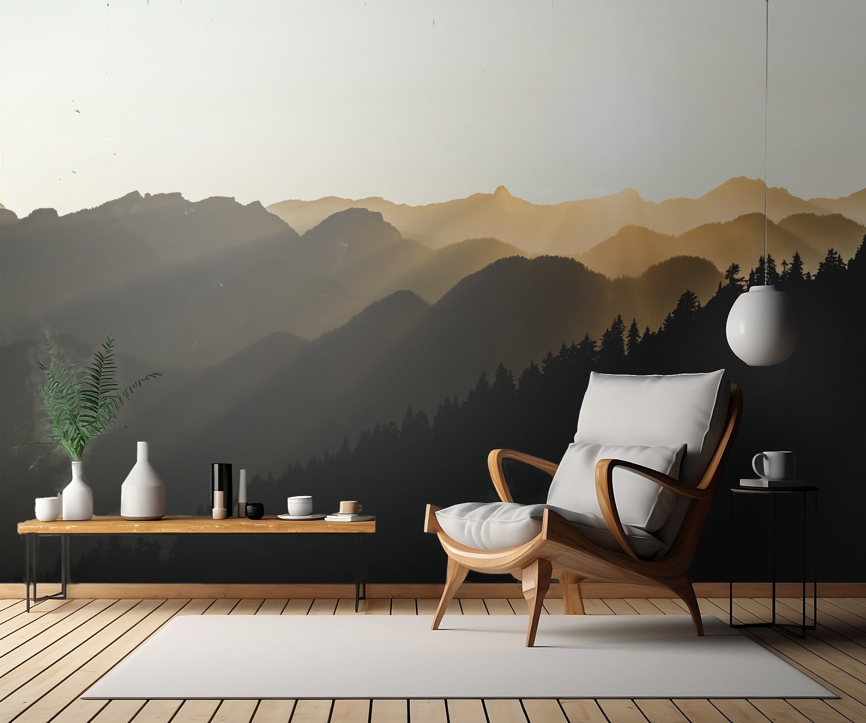 Blicka ut över det majestätiska landskapet med solnedgångens vackra färger och de strålande solstrålarna som dansar över bergen. Tapeten skapar en känsla av lugn och ro samtidigt som den tillför en touch av äventyr i ditt hem. Upplev den unika atmosfären när naturens skönhet smälter samman med ditt inre utrymme.