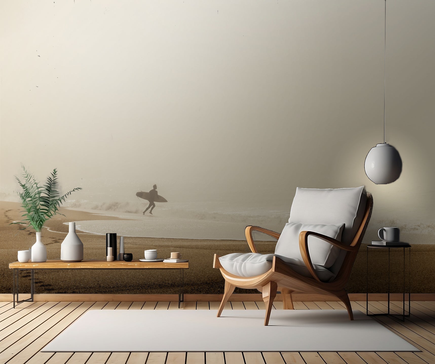 Med inspirerande motiv av surfare som tar sig an vågorna och den skimrande blåa oceanen, ger denna tapet en känsla av rörelse och action till rummet. De lugna beiga tonerna av sand och dimma skapar en harmonisk känsla som passar perfekt in i en avslappnad och stilren inredning.