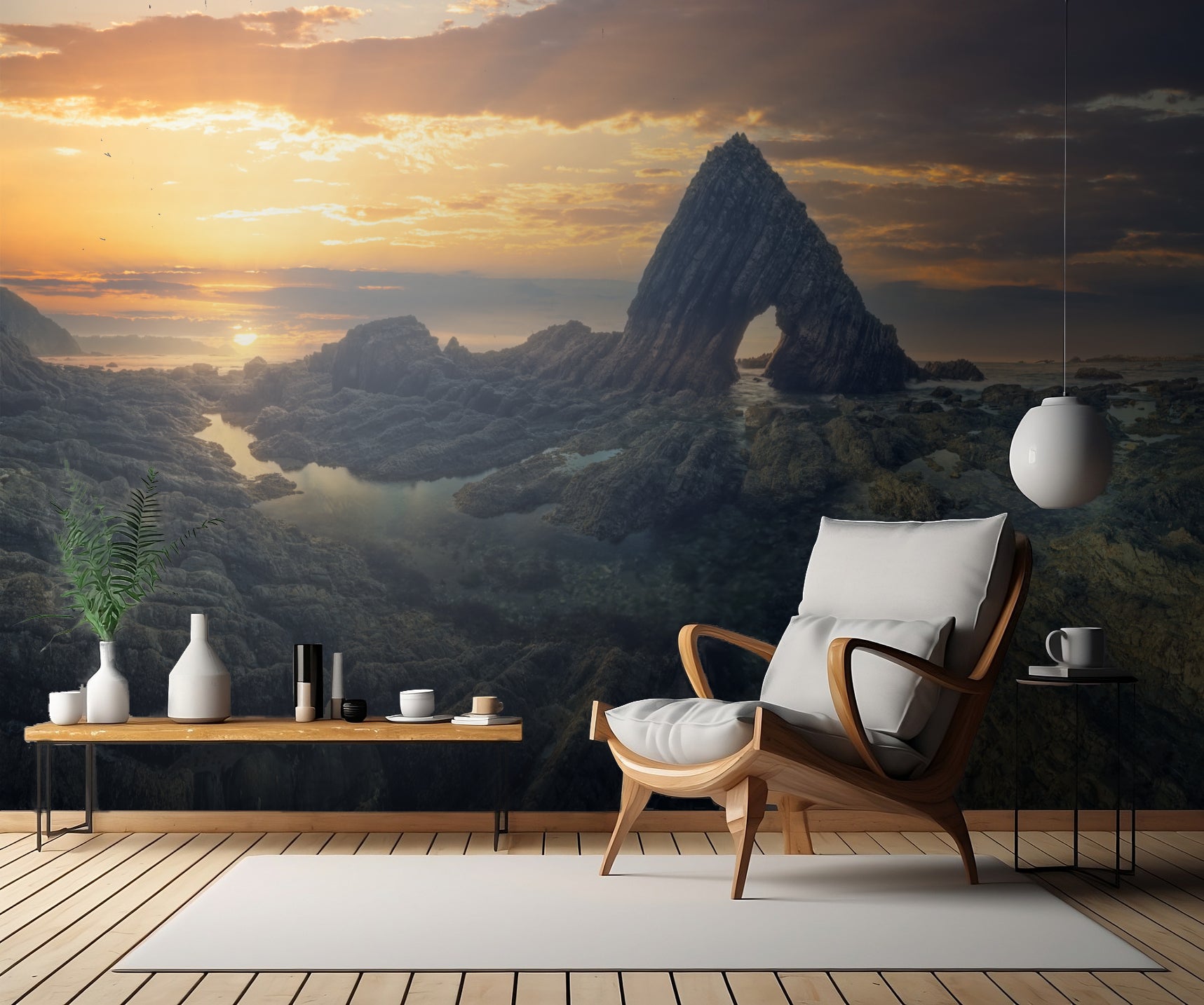 Välkommen till ett äventyr i naturen med väggtapeten "The Door". Låt dig förföras av dess otroliga detaljrikedom som tar dig med på en resa bland klippformationer, fantastiska havslandskap och naturens egna konstverk.