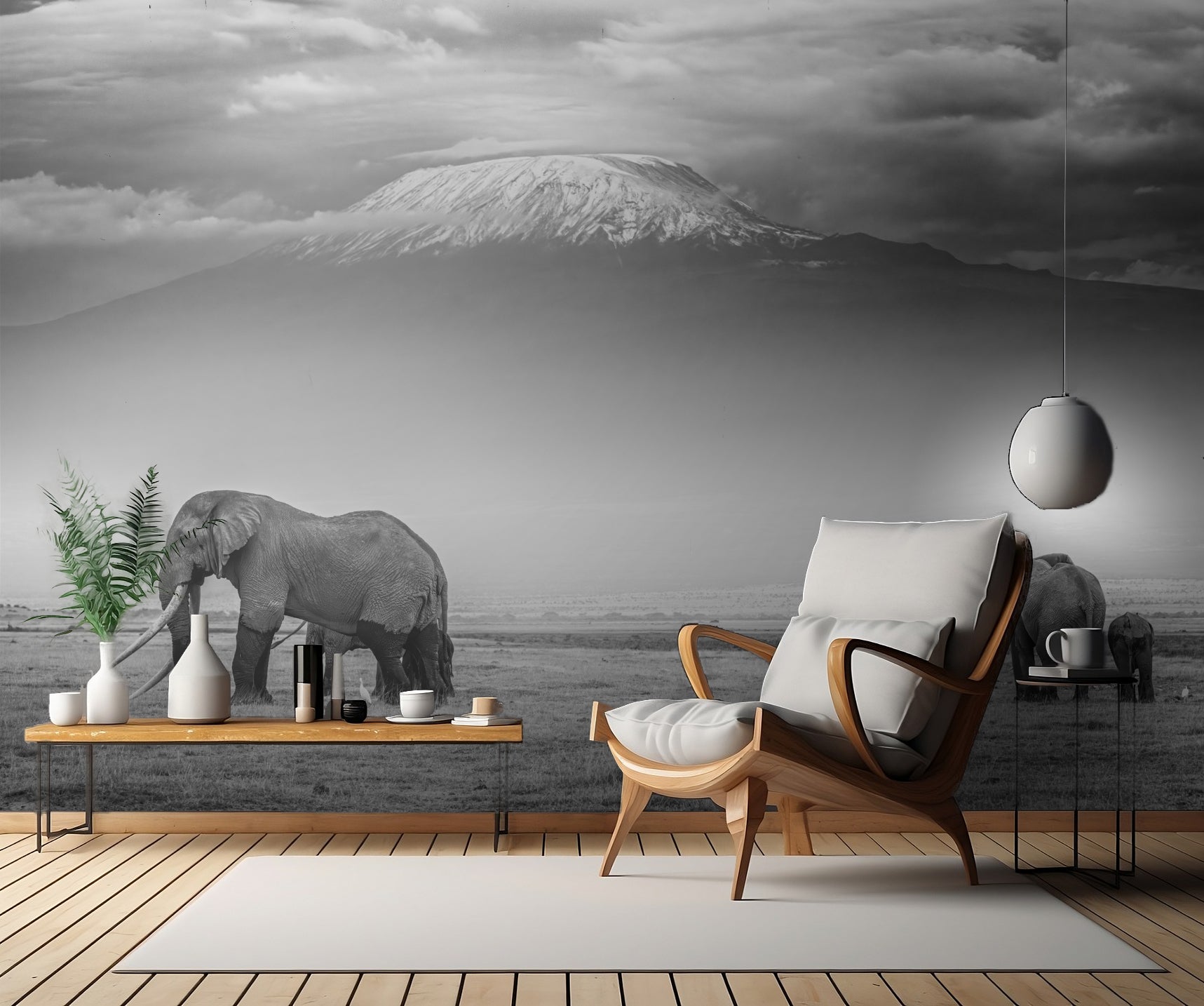 Låt dig förtrollas av synen av de mäktiga elefanterna som strövar fritt i sitt naturliga habitat. Den svartvita monokroma paletten ger en tidlös känsla av lugn och stil till ditt rum. Varje gång du tittar på denna tapet kommer du att känna dig som om du är mitt i den vilda savannen i Afrika.