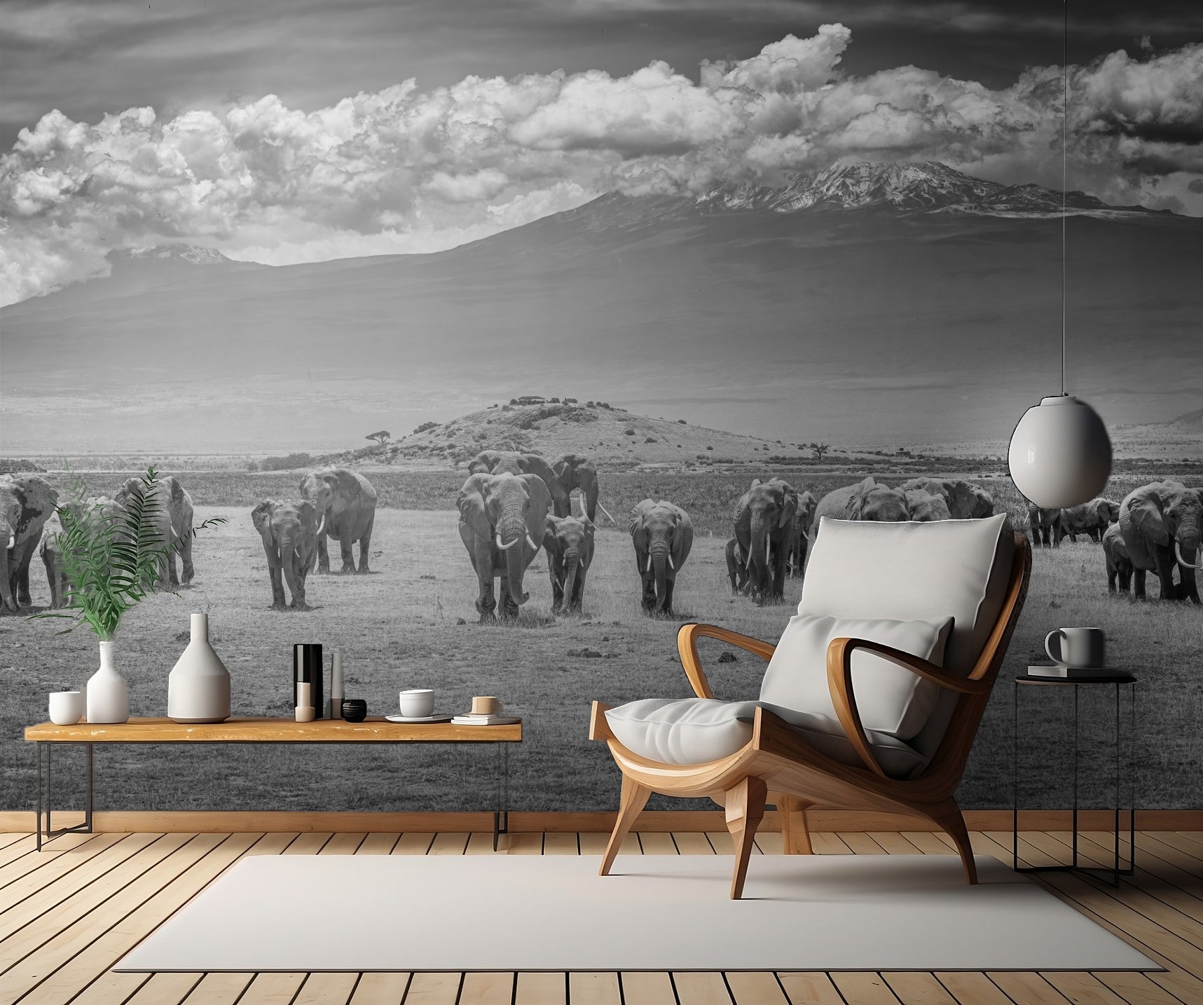 Med sitt svartvita monokroma tema ger tapeten en elegant och modern känsla till vilket rum som helst. Varje gång du tittar på den kommer du att känna dig inspirerad av skönheten i naturen och djurlivet i Amboseli, Kenya, Afrika.