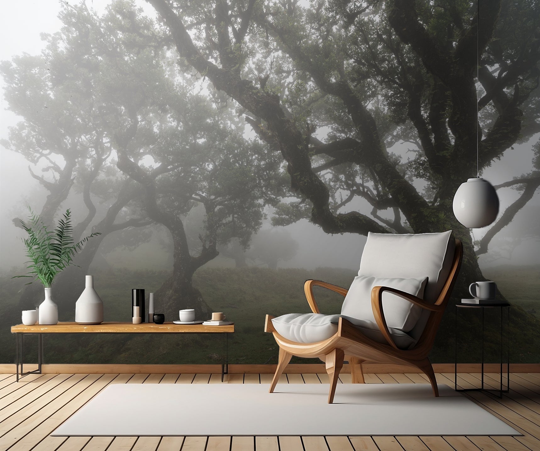 Med en balanserad blandning av träd, dimma och ett landskap i förändring ger denna tapet en känsla av lugn och ro. Perfekt för sovrummet, vardagsrummet eller kontoret, där du vill skapa en harmonisk och inspirerande atmosfär.