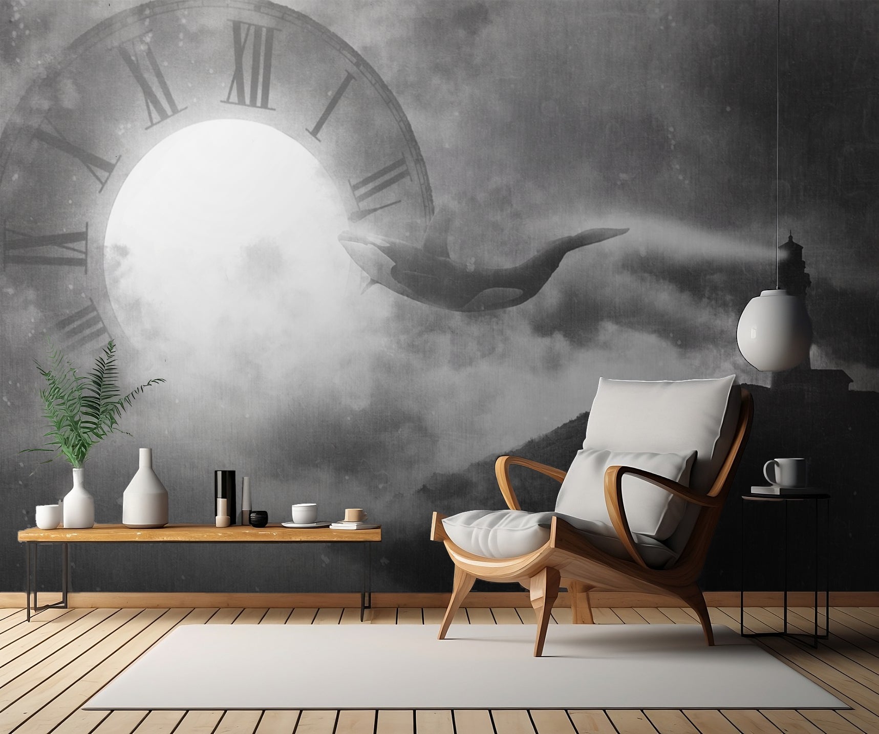 En imponerande klocka symboliserar tidens gång och ger tapeten en extra touch av intellektuell och konstnärlig karaktär. Du kommer förundras över detaljerna i varje enskild del av detta konstverk - från den fantastiska fyren som lyser upp horisonten till de magnifika späckhuggarna som dansar i vattnet.