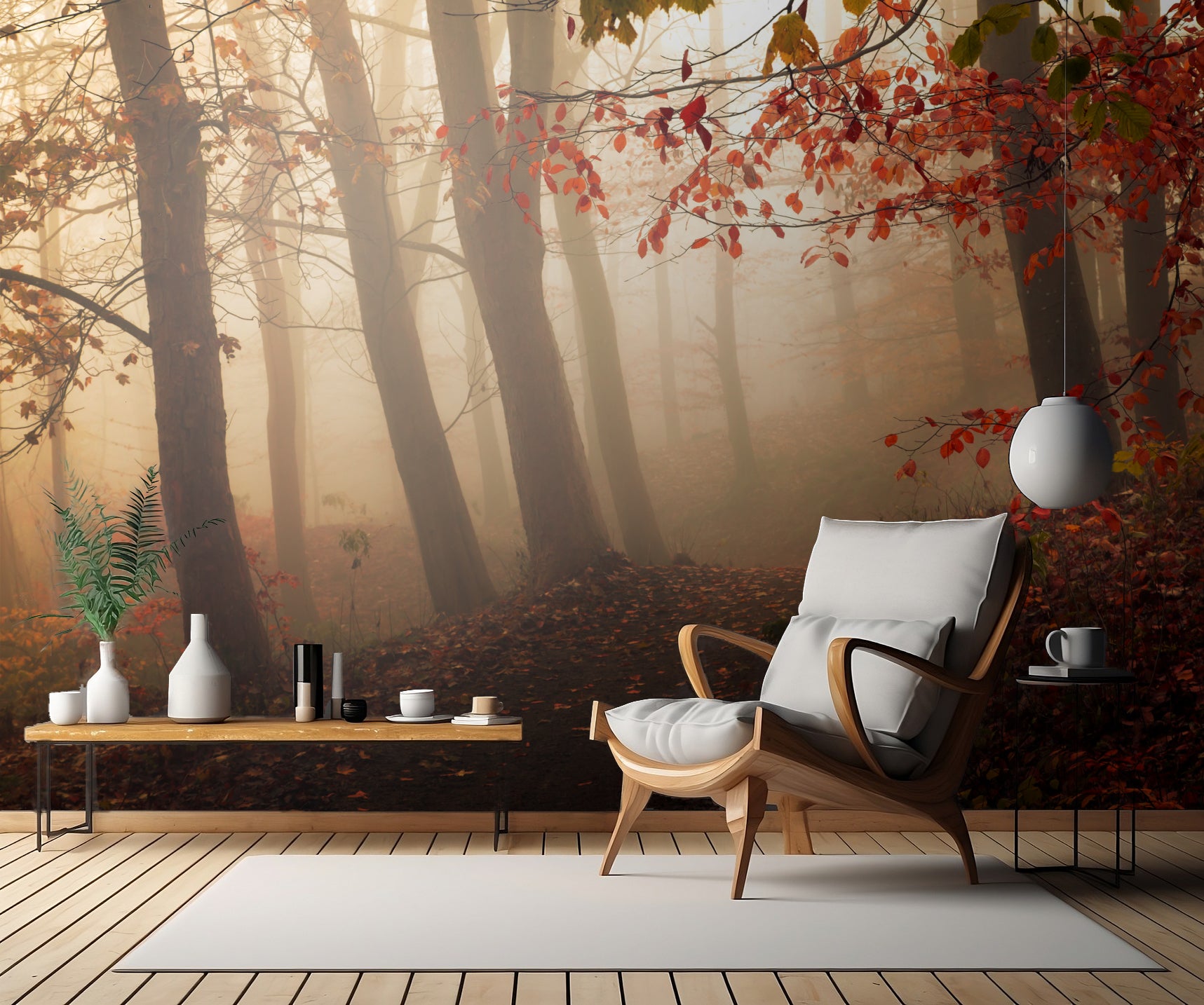 Den här tapeten ger rummet en intrigande och lockande känsla med sitt skogstema. Med "Towards the light" får du en atmosfär av skog, dimma och höst. Perfekt för den som önskar sig en inbjudande och mysig atmosfär i sitt hem.