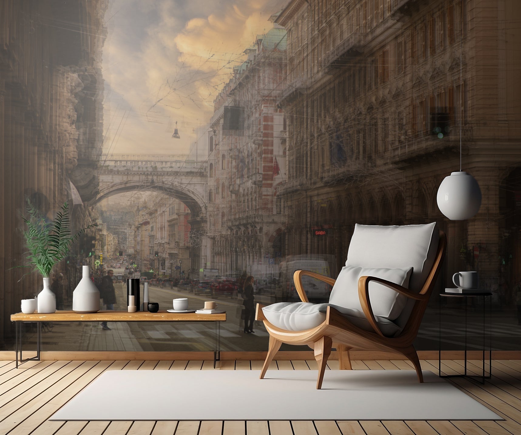 Med ett iögonfallande dubbelexporträttdesign blir denna tapet ett verkligt konstverk på din vägg. Tack vare den kreativa redigeringen får du en imponerande balans mellan verklighet och drömlika inslag. Det är som att gå i en stad där två världar möts och skapar en unik atmosfär.