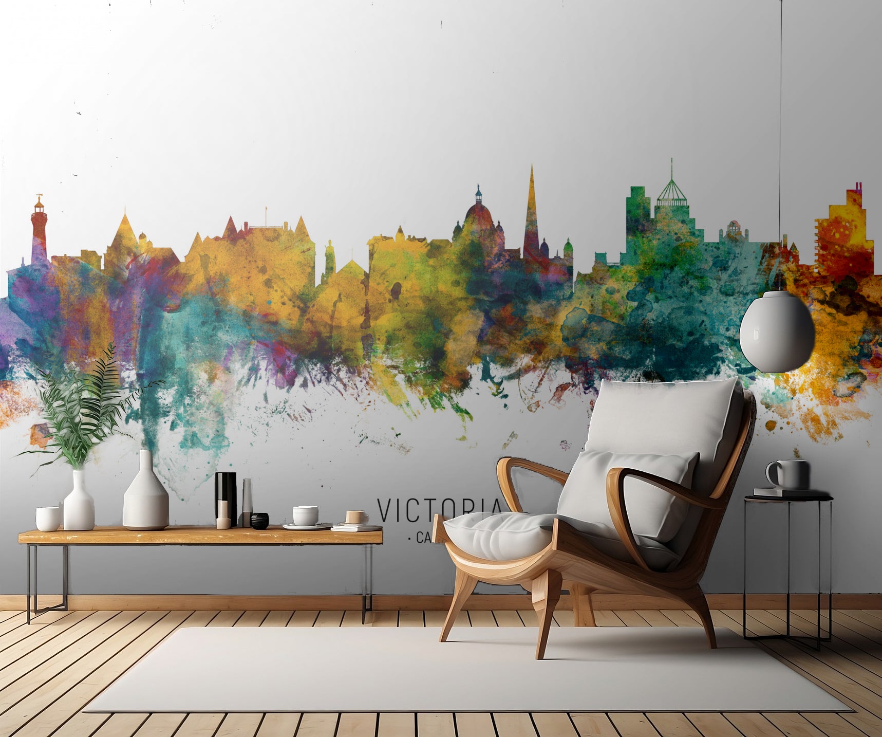 Förlora dig i skönheten av Victoria, Kanadas skyline med denna målade väggtapet skapad av den berömda konstnären Michael Tompsett. Genom att kombinera vattenfärgsteknik med stadslandskapet i Victoria, har Tompsett skapat en detaljrik och färgstark målning som ger ditt rum en unik touch av storstadscharm.