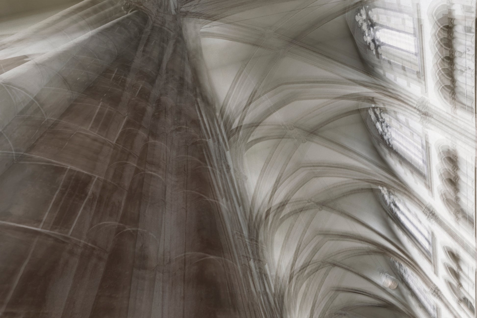 Dröm dig bort till en lugn och fridfull plats med väggtapeten "View to the Windows" skapad av Roswitha Schleicher-Schwarz. Tapeten fångar en magisk dubbelexponering av St. Paulskirche i München, Tyskland, och ger rummet en känsla av stillhet och helighet. Med dess suddiga och vackra mönster i beige och brunt ger tapeten en känsla av lugn och ro.