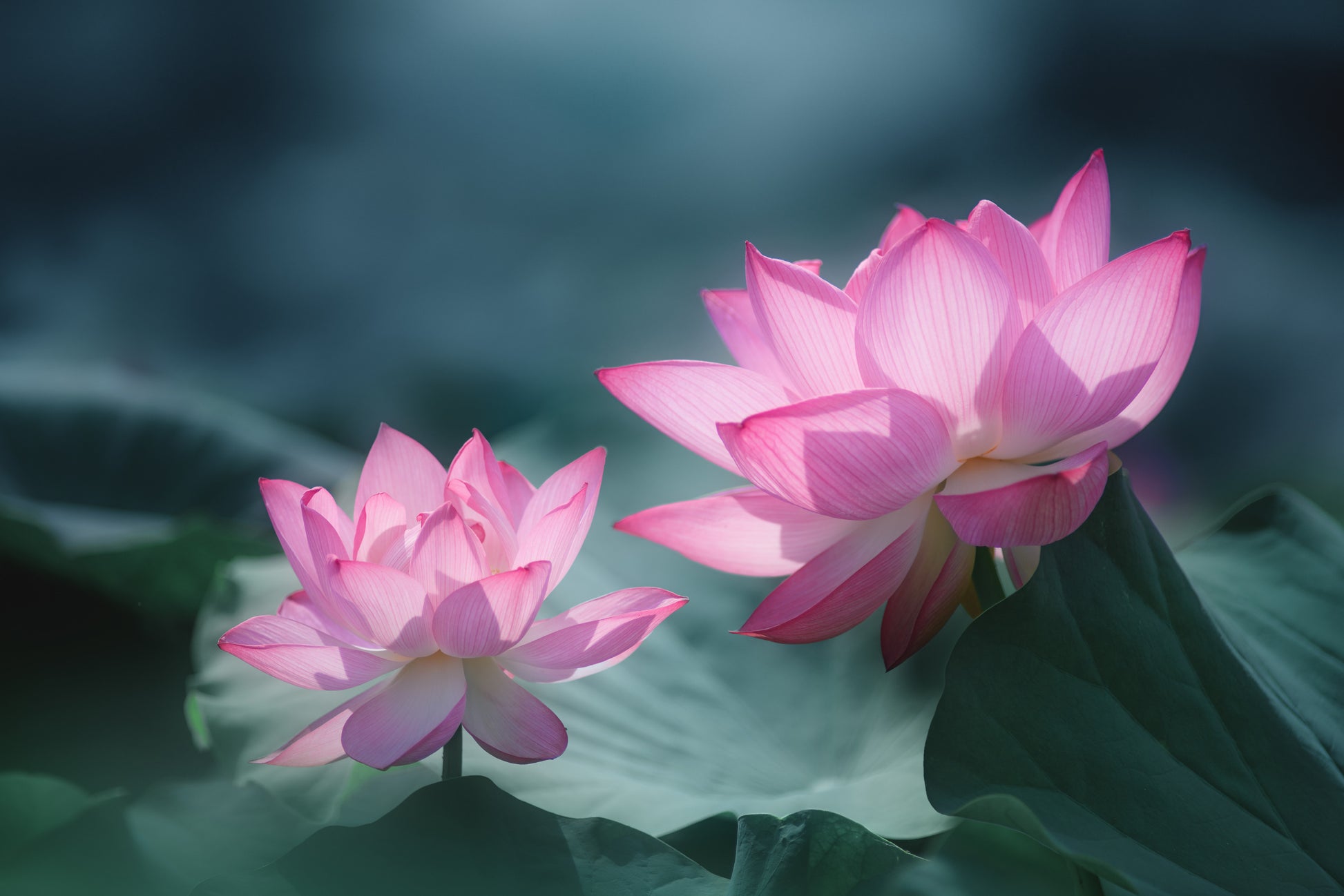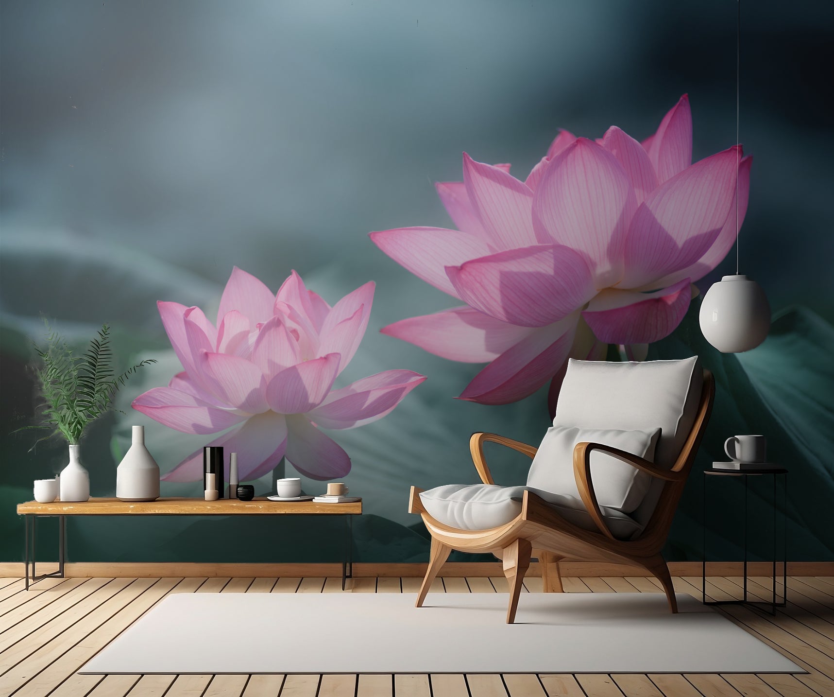 Tapetens design fångar blicken med sina makrofotografier av lotusblommor i olika djup, vilket skapar en intressant kontrast och gör varje motiv fascinerande att utforska. Med blommor i mjuka rosa nyanser som framhävs mot en lugn och harmonisk grönska, ger denna tapet en känsla av ro och harmoni till rummet.