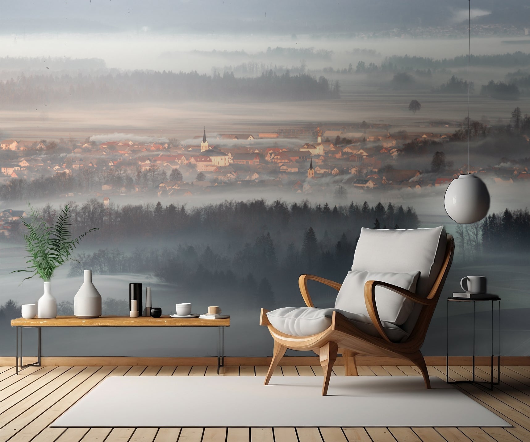 I detta panorama får du se en pittoresk by, där de charmiga husen erbjuder en härlig kontrast till de grönskande omgivningarna. En liten kyrka vilar i skogen och tillför ytterligare mystik till platsen. Du kommer att känna dig som om du vandrar genom en dimmig saga.