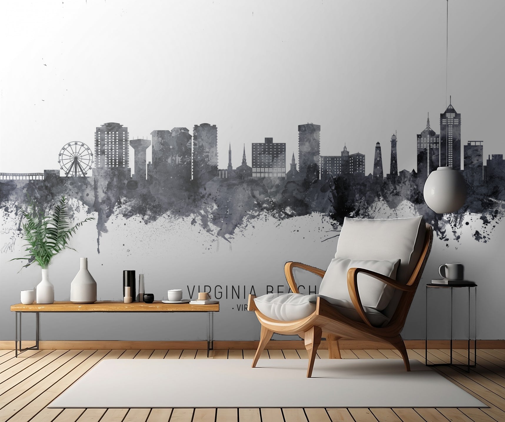 Skapa en känsla av urban elegans och sofistikation i ditt hem med denna vackra tapet. Oavsett om du är en beundrare av vattenfärgsmåleri eller bara älskar storslagna stadslandskap kommer "Virginia Beach Virginia Skyline" att bli ett iögonfallande tillskott till din inredning. Ge ditt rum en touch av konstnärlig skönhet och beställ denna fantastiska tapet idag.