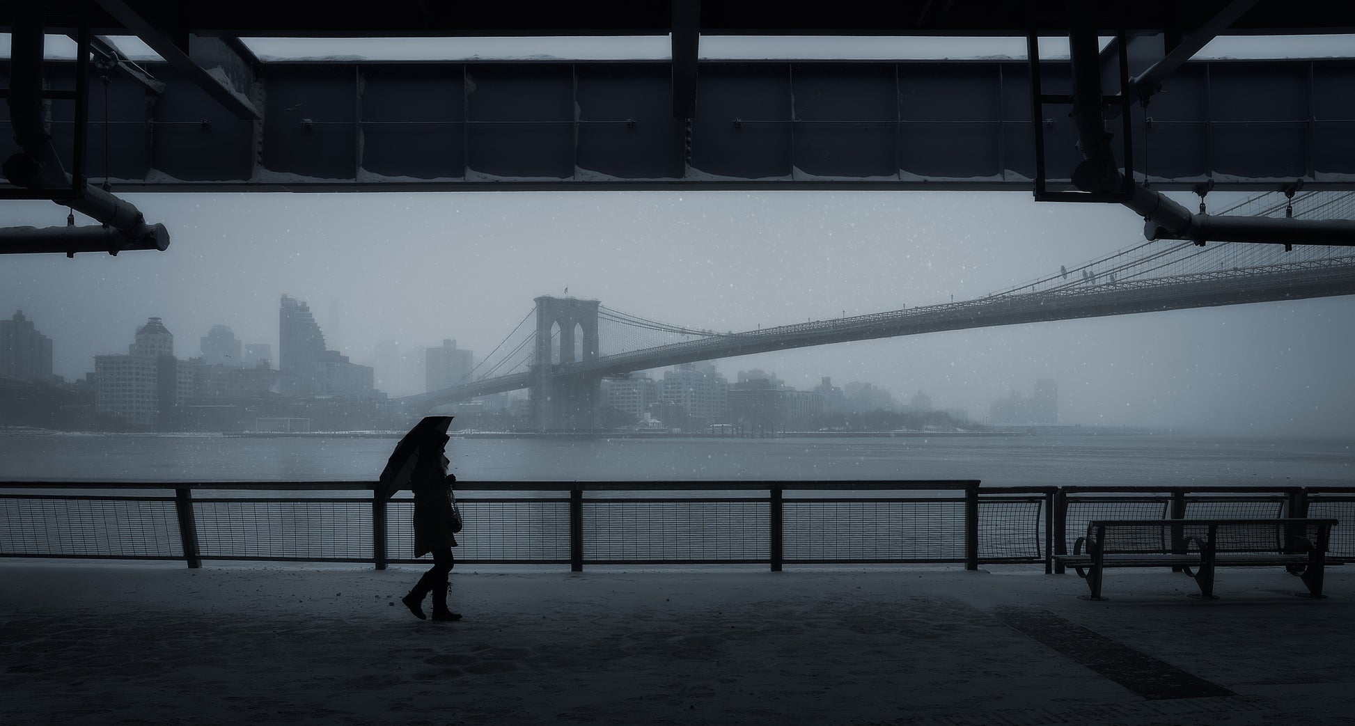Stegsäkert på trädäcket, vandrar du längs med flodens strand. Lugnet i vattnets ström och de majestätiska broarna som sträcker sig över dig bildar en harmonisk panorama som tar andan ur dig. Värt att nämna är den anonyma gestalten som vandrar framför dig, på en pittoresk gata iklädd en siluetterad paraply, vilket ger en poetisk touch till motivet. Denna väggtapet, med namnet "Walking beside the River", fångar den ikoniska känslan av att promenera längs med trottoaren på gatorna i New York City.