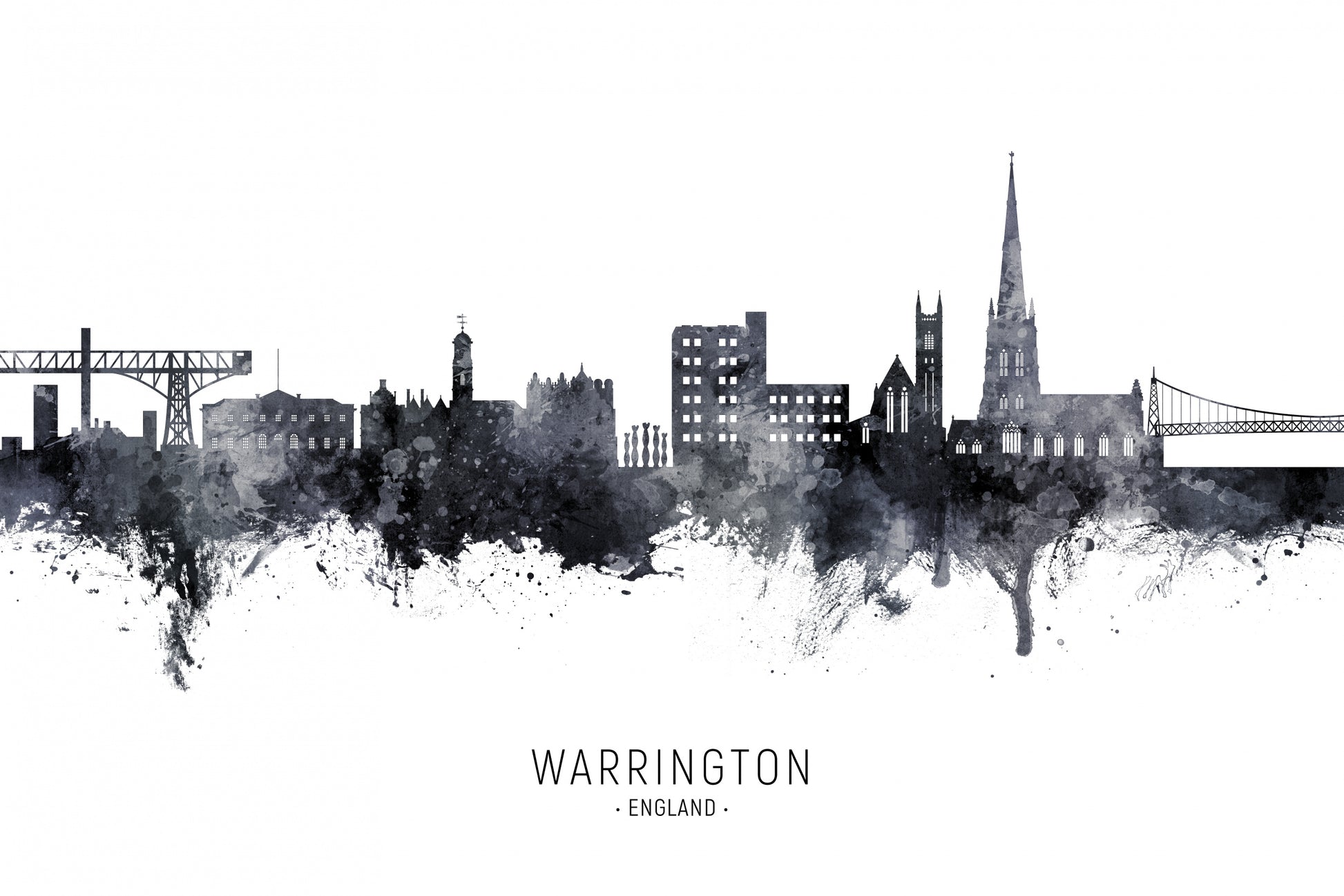 Få en unik och konstnärlig touch i ditt hem med väggtapeten "Warrington England Skyline". Denna vackra tapet visar stadssilhuetten från Warrington i England, skapad av den begåvade konstnären Michael Tompsett.