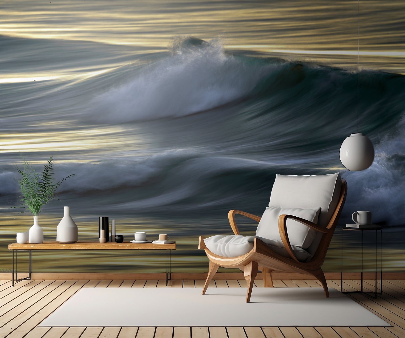 Denna unika tapet passar perfekt i vardagsrummet, sovrummet eller varför inte i ett kontorsutrymme för att skapa en lugnande arbetsmiljö. Låt dig förföras av vågornas skönhet och skapa en känsla av lyx och elegans med "Waves in evening light".