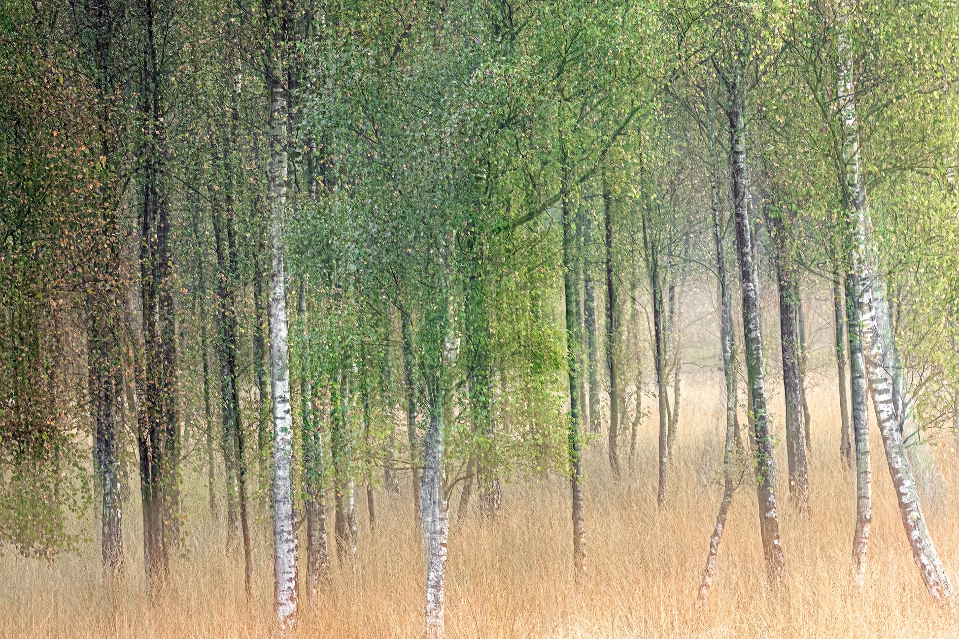 Skapad av konstnären Henk Goossens fångar denna tapet verklighetstrogna detaljer av ett skogslandskap, komplett med grönt gräs och spegelblanka vattendrag. Med en färgpalett som för tankarna till en nationalpark i Nederländerna ger "Waving trees" en känsla av stillhet och harmoni.
