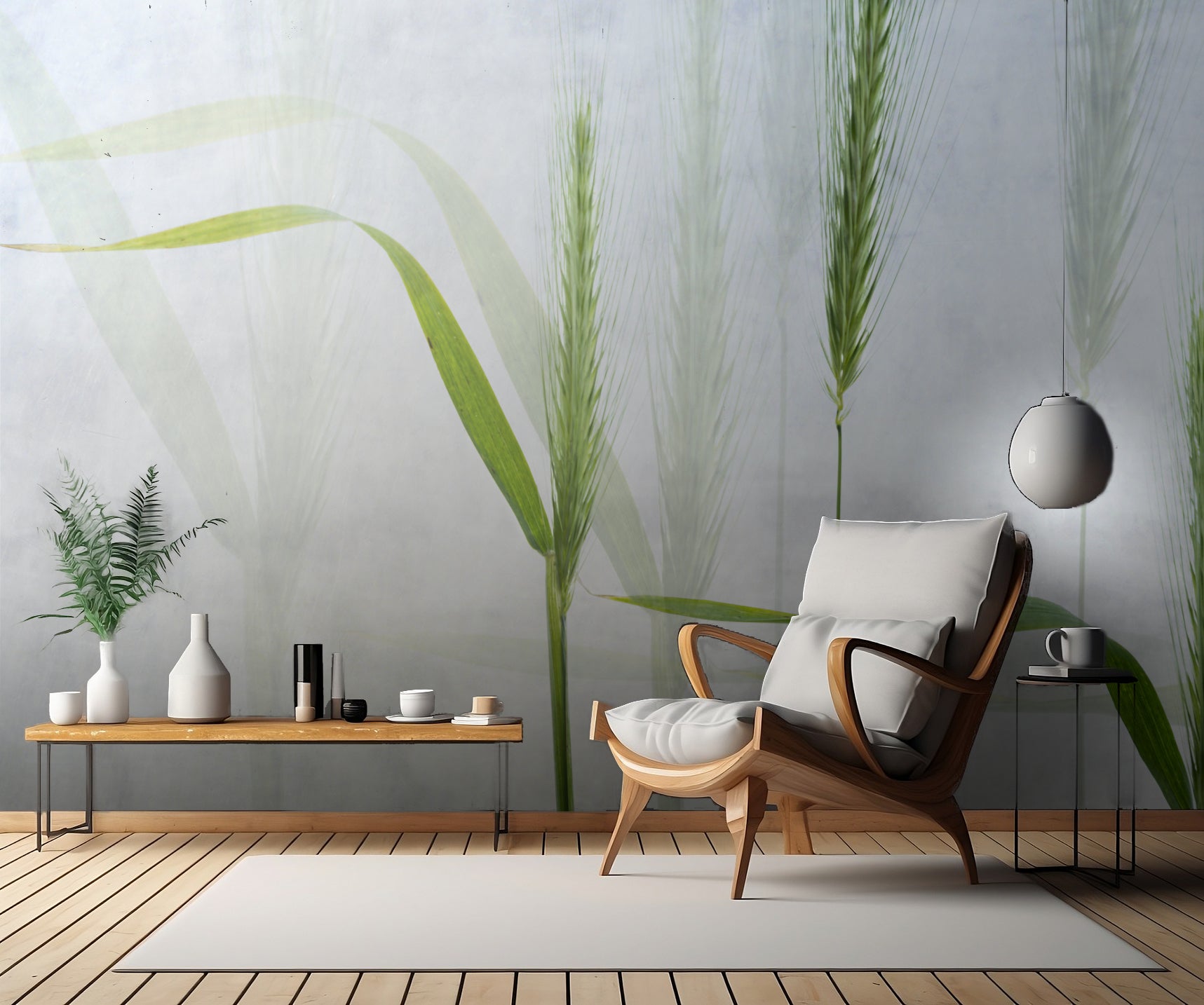 Tapeten föreställer en vacker mix av gröna blad och veteåkrar, perfekt för dig som älskar naturen och lantliga miljöer. Med motiv av gröna blad och gräs ger denna tapet en fräsch och livlig känsla till ditt rum.