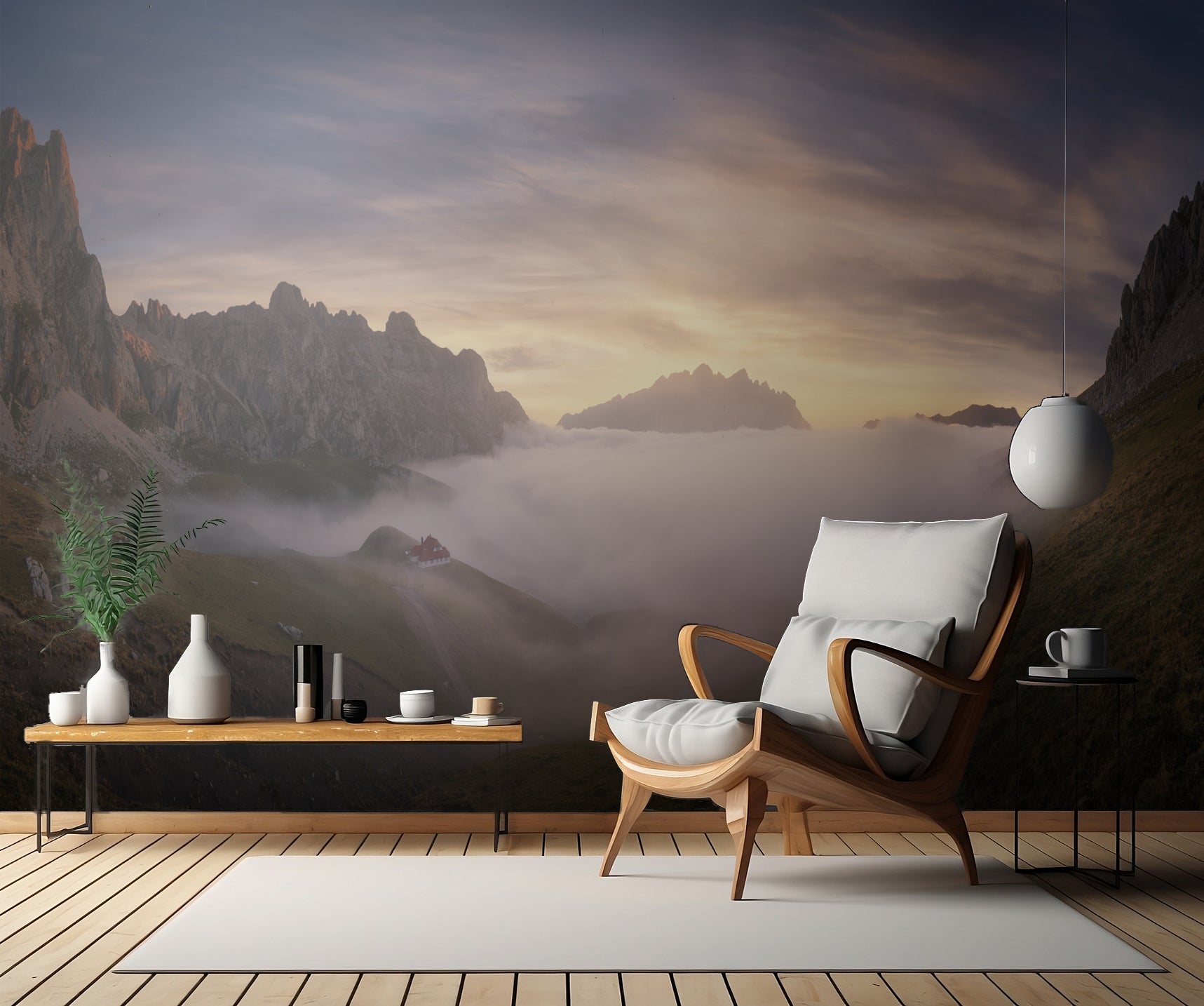 När du ser på denna väggtapet kommer du genast att föras bort till en vacker bergsutsikt. Tapeten fångar den makalösa skönheten i bergstopparna som sträcker sig mot himlen. Utsikten över det frodiga dalen, de mjuka morgonmolnen och dimman som sveper lätt över bergen skapar en känsla av lugn och harmoni.