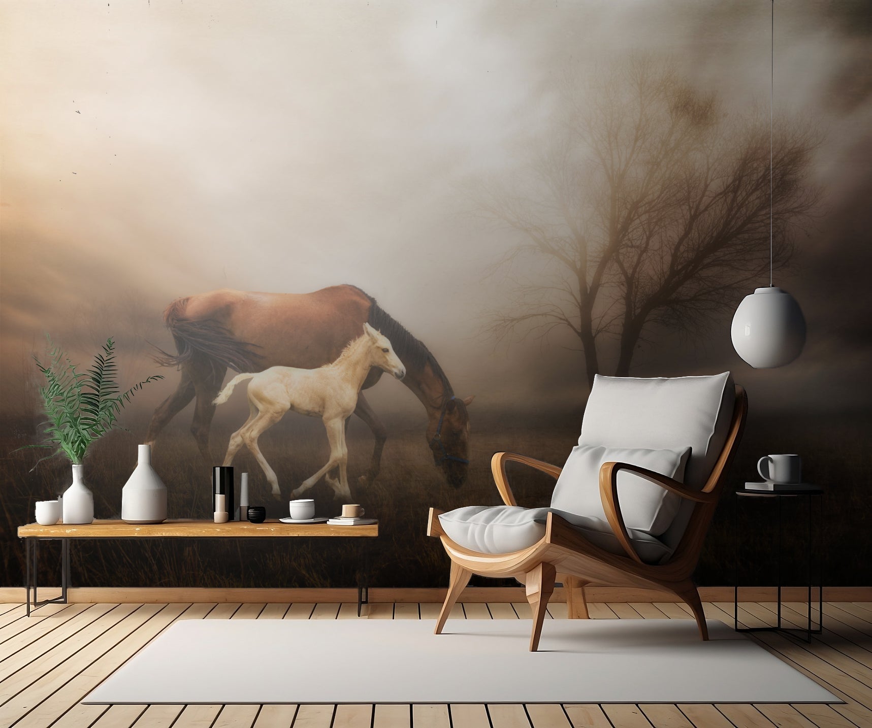 Ta med naturen in i ditt hem med väggtapeten "'...we're different, but the same...'" skapad av Charlaine Gerber. En mystisk dimma sveper över landskapet där flockar av hästar strövar omkring. Den måleriska känslan i tapeten ger en tidlös och harmonisk atmosfär till rummet.