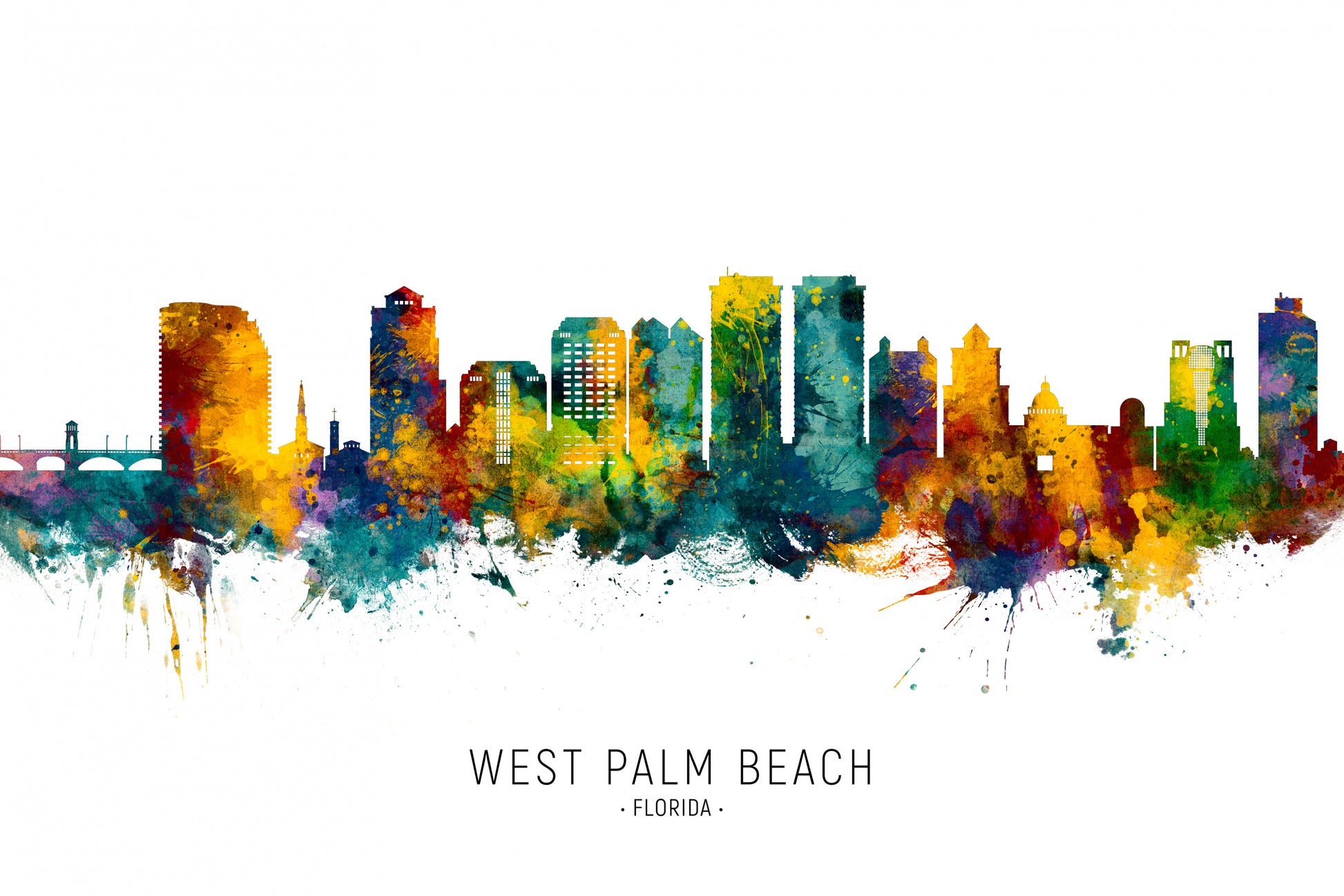Förgyll ditt rum med en fantastisk väggtapet av "West Palm Beach Florida Skyline" skapad av den talangfulla konstnären Michael Tompsett. Med denna vackra vattenfärgsmålning kan du skapa en atmosfär av staden West Palm Beach, Florida, i ditt eget hem.
