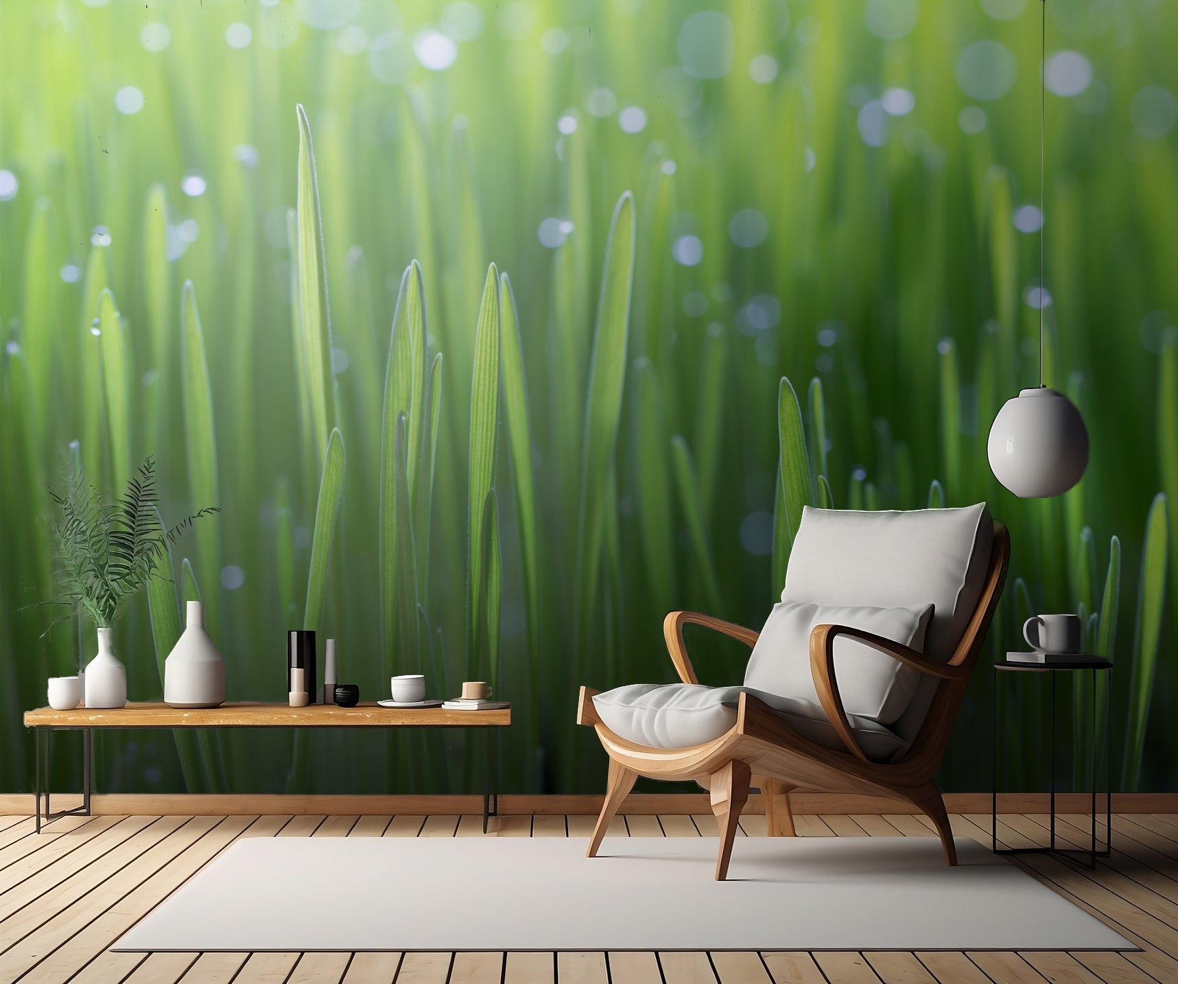 Med hög kvalitet och detaljerad design ger denna tapet en känsla av närhet till naturen. De mjuka gröna tonerna och de glittrande daggdropparna skapar en känsla av friskhet och livfullhet i rummet. Varje gång du tittar på denna tapet kommer du att känna dig som om du befinner dig mitt i ett lugnt och stilla landskap.