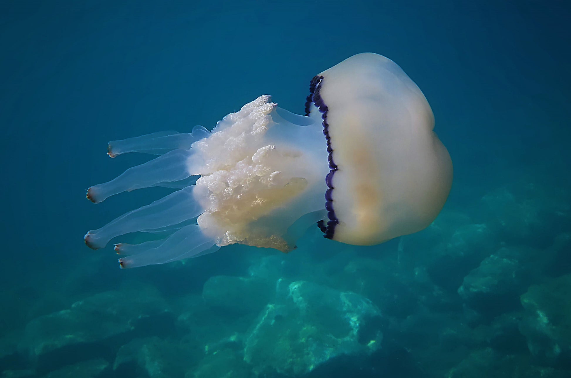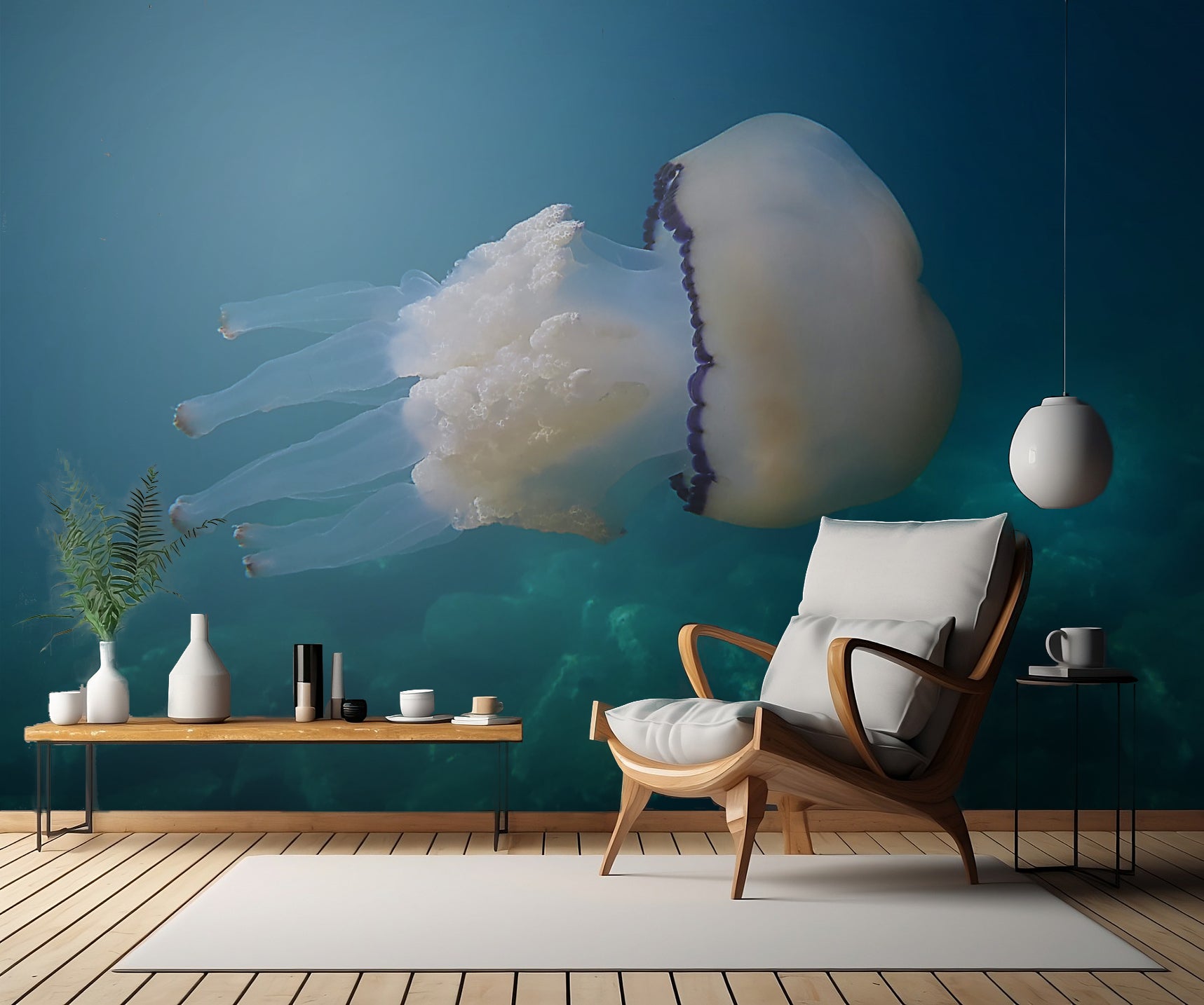 Få in naturens skönhet i ditt hem med väggtapeten "White elegance" skapad av Riccardo Mazzoni. Denna tapet är perfekt för dig som älskar vatten, havets djup och det vilda. Med dess fantastiska illustrationer av marint liv som medusor och andra varelser tar du med en bit av undervattensvärlden in i ditt hem.