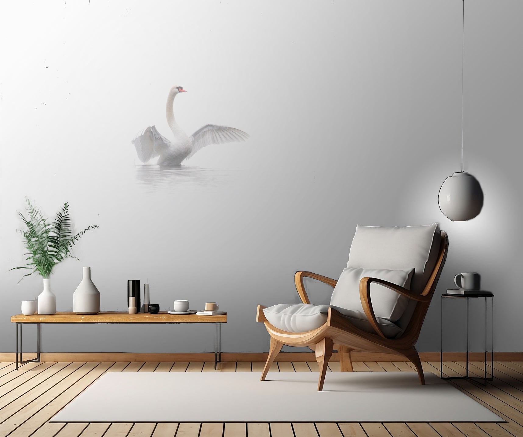 Upplev en poetiskt vacker och enastående flykt på din vägg med väggtapeten "White" av Fabien BRAVIN. Denna väggtapet fångar den känsliga och majestätiska naturen hos svanar och fåglar i en enkel och minimalistisk design. Varenda detalj i dessa vita fåglar är framställd i en ljus, high-key stil som skapar en känsla av frid och harmoni i rummet.