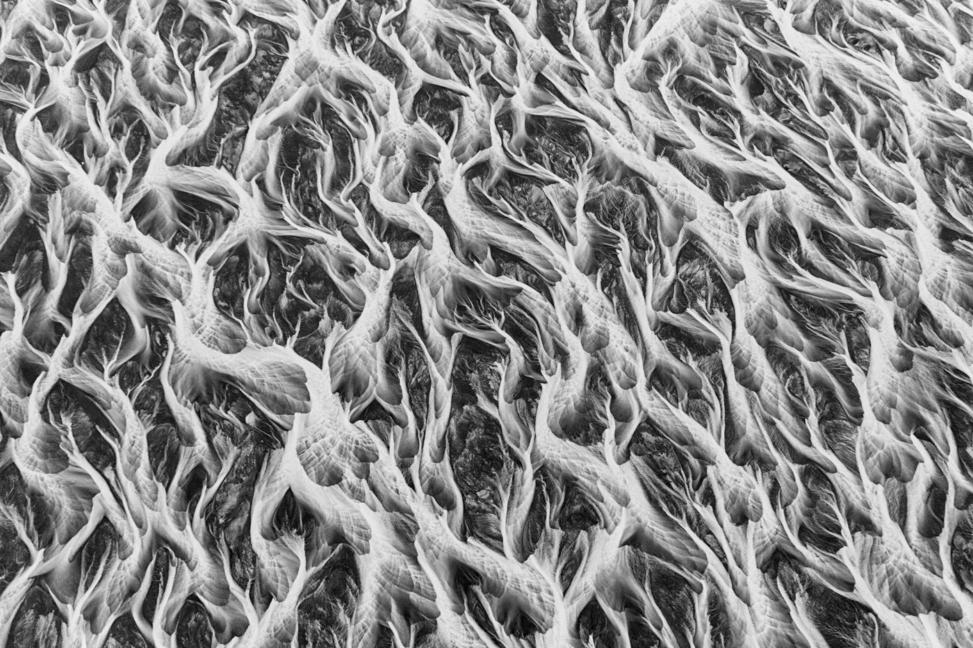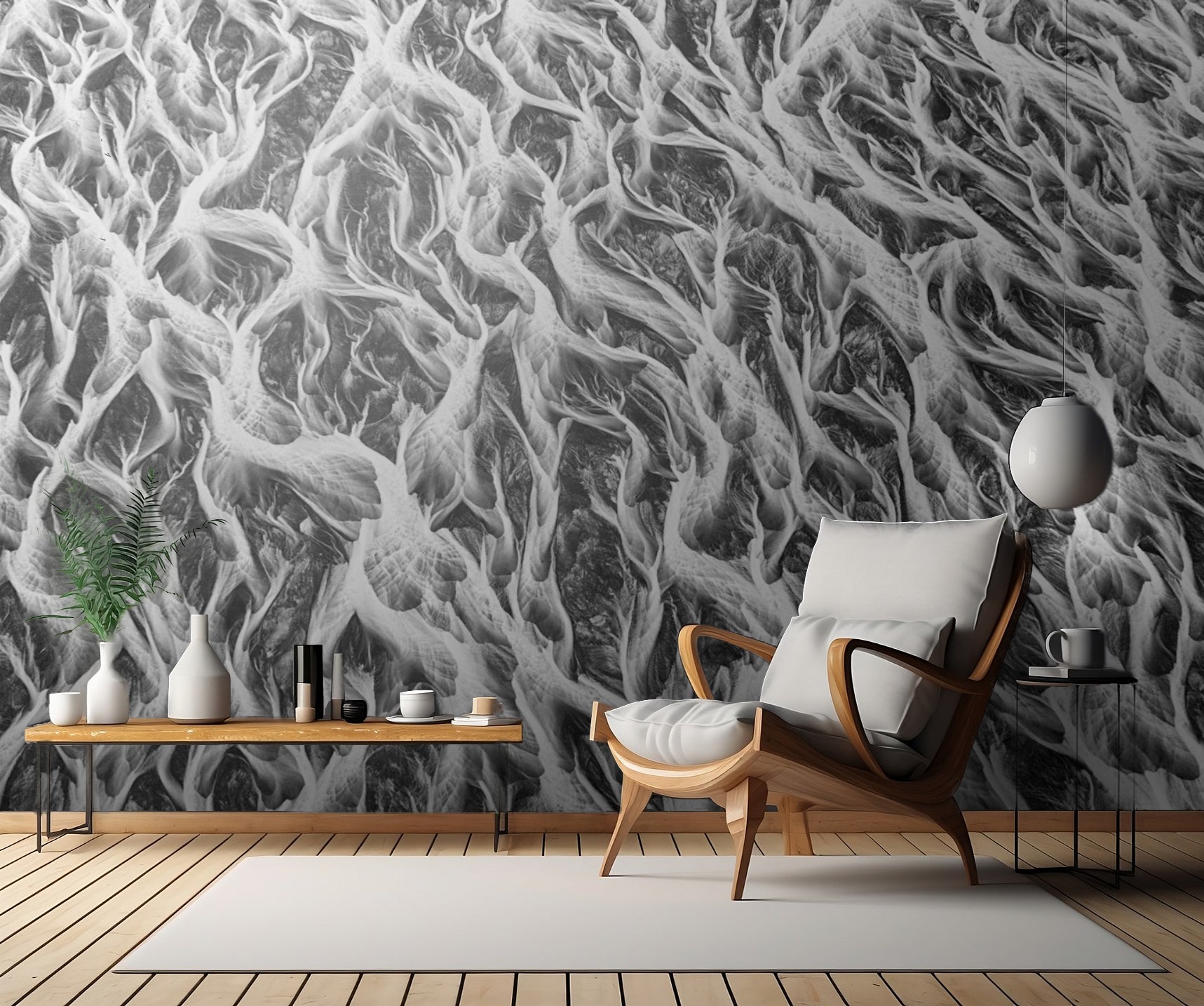 Detta landskapsinspirerade konstverk hämtar sin inspiration från de vidsträckta landskapen i Island, där floder slingrar sig genom det vackra landskapet. Med sitt monokroma tema kan tapeten skapa en lugn och harmonisk atmosfär i rummet samtidigt som den ger en känsla av energi och rörelse med sina flödande former.