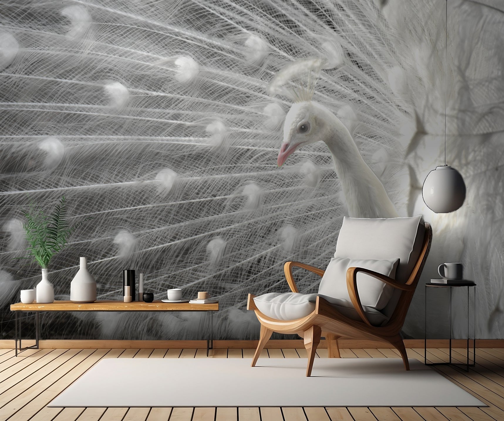 Möt peafowlen och andra vackra fåglar i deras naturliga miljö. Deras eleganta fjädrar skapar en känsla av lugn och harmoni i rummet. "Wight is White" är perfekt för alla som älskar djur och vill ge sitt hem en touch av enkelhet och friskhet.