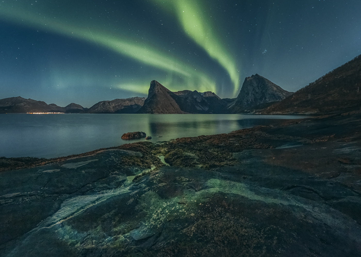 Låt dig fängslas av de vindlande ljusen som dansar över det stilla vattnet, klipporna och den vidsträckta horisonten. Med denna tapet kan du förvandla ditt rum till en fridfull oas där du kan drömma dig bort till vackra landskap och stjärnklara nätter.