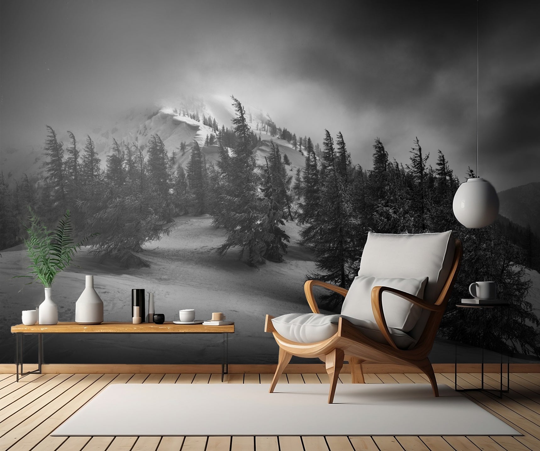 Denna unika tapet fångar essensen av vintern med sina snötäckta träd och imponerande bergstoppar. Varje detalj har blivit noggrant målad i svartvitt för att förstärka det dramatiska och lugnande i scenen.