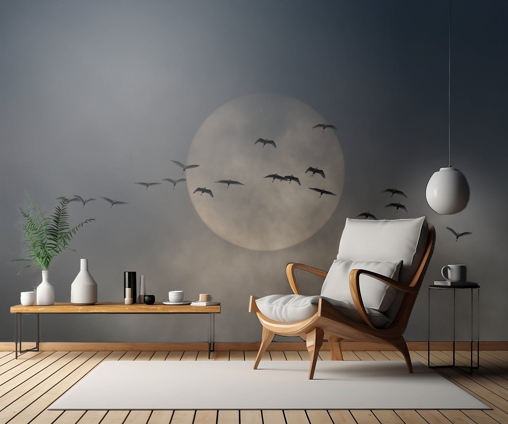 Möt en hel flock av vilda fåglar som flyger i formation över en rund, cirkulär bakgrund som ger en känsla av rörelse och energi. Den mjuka färgpaletten med ljusa toner av blått och vitt gör att tapeten passar perfekt in i de flesta rum och ger en lugn och harmonisk atmosfär.