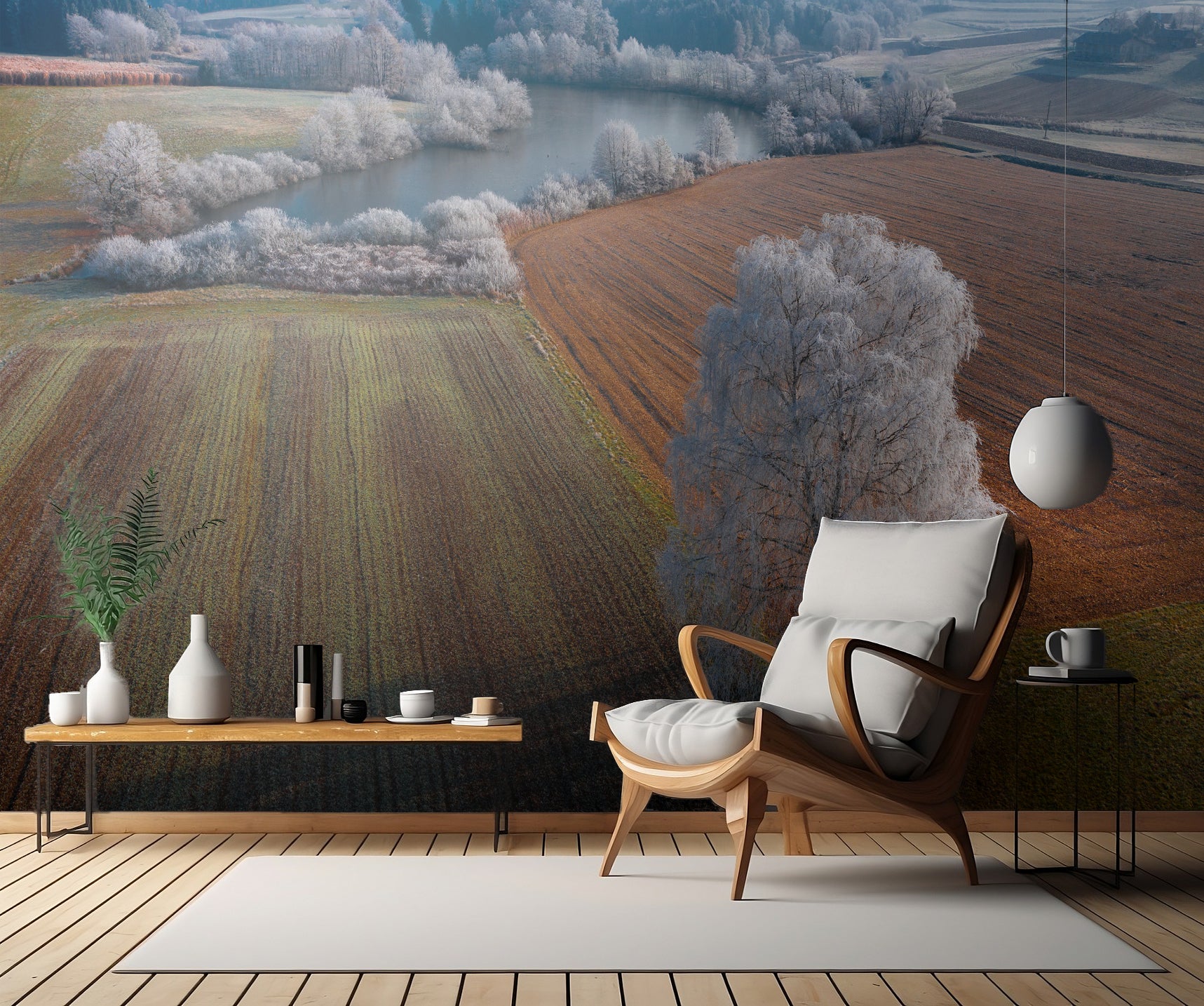 Denna tapet tar dig med till den vackra landsbygden där bondgårdar och jordbruksmarker sträcker sig så långt ögat kan nå. Genom att ha "Winter idyll" på din vägg får du uppleva vinterlandskapets säsongsbetonade charm året runt.
