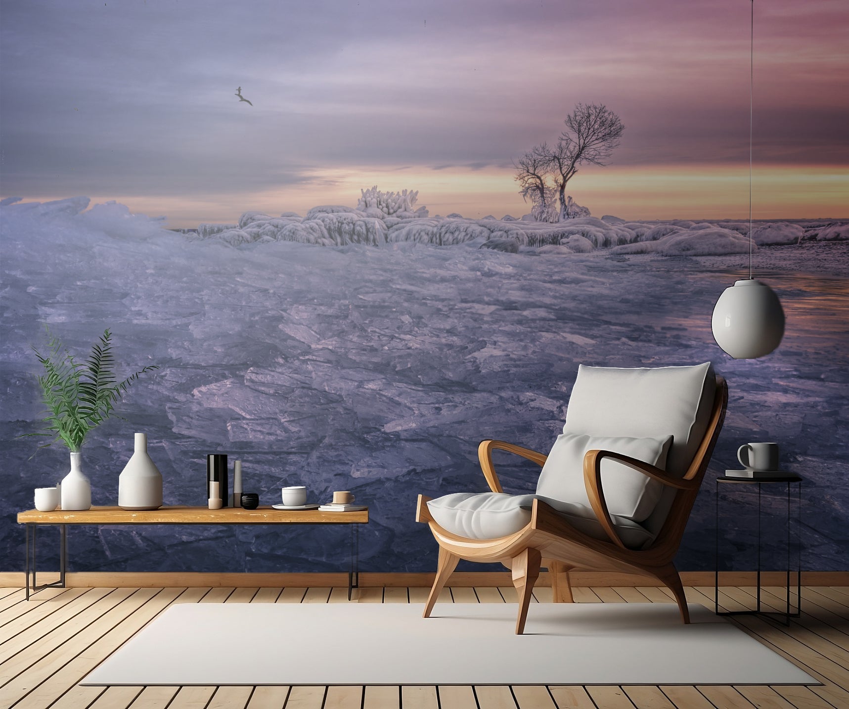 Denna unika tapet fångar essensen av vinterns skönhet och framhäver kontrasten mellan den vita snön och det isiga landskapet. Ensamstående träd står i kontrast mot den iskalla bakgrunden och ger en känsla av ensamhet och stillhet.