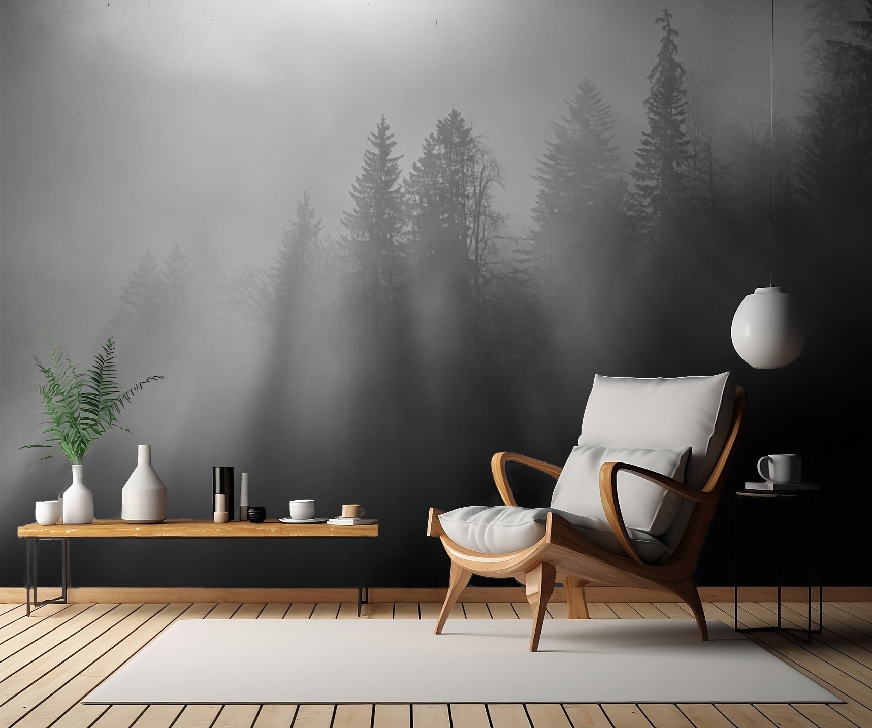 Med en perfekt balans mellan skuggor och ljus skapar tapeten en atmosfär av daggiga skogar och disigt landskap. Den svartvita färgsättningen ger rummet ett elegant och tidlöst utseende och passar perfekt i alla inredningsstilar.