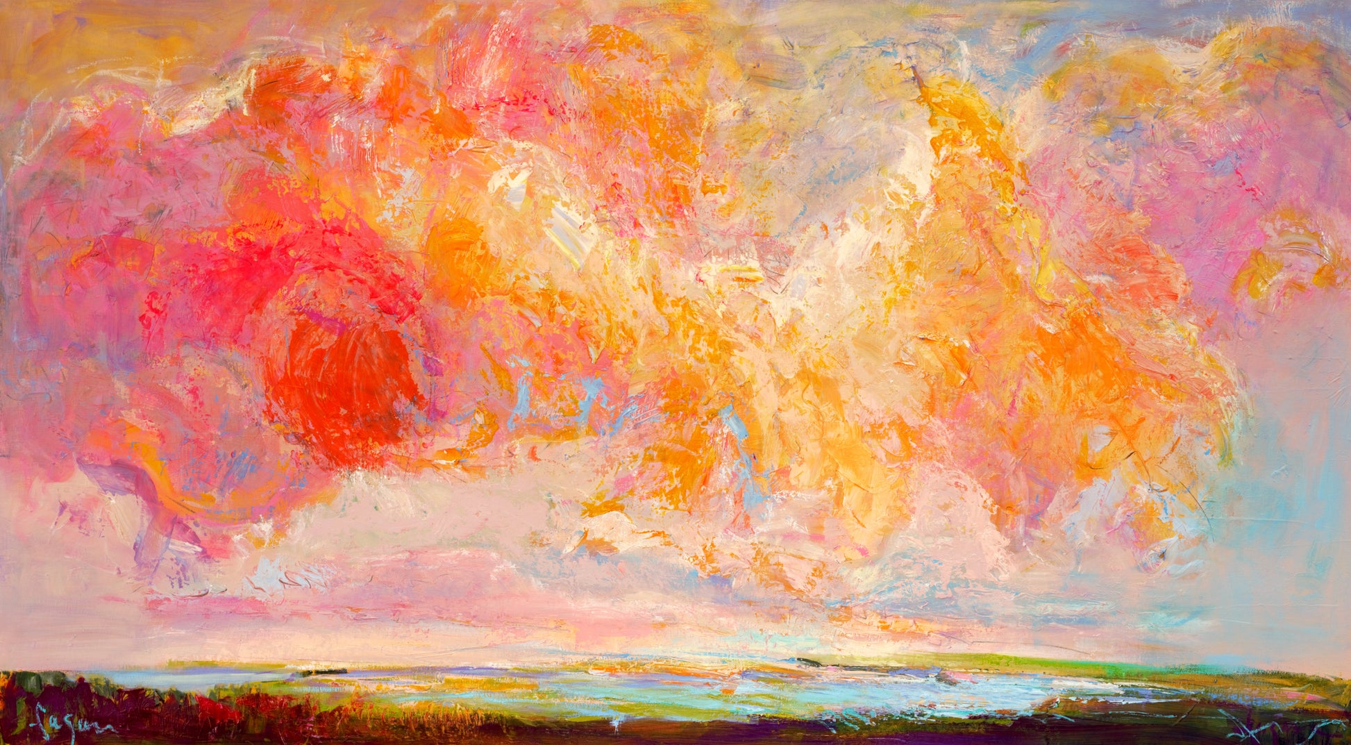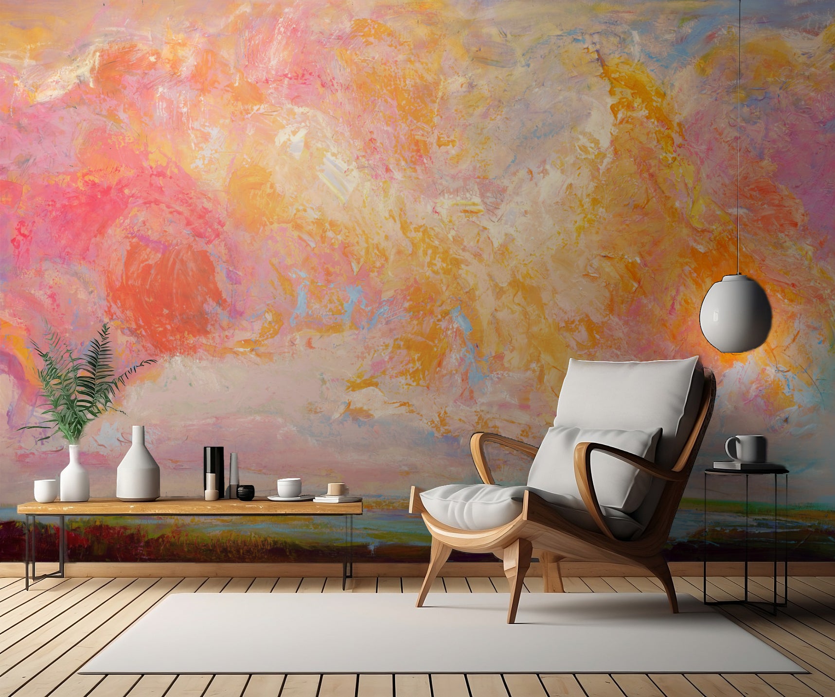 Med tapeten "With a Happy Heart" skapad av konstnären Dorothy Fagan kan du förvandla ditt rum till en färgstark och målerisk miljö. Tapeten fångar skönheten i landskapet med sina målade skiftningar av himmel, moln och solnedgångar. Varje penseldrag ger en känsla av kvällens magi och skapar en lugnande atmosfär i rummet.