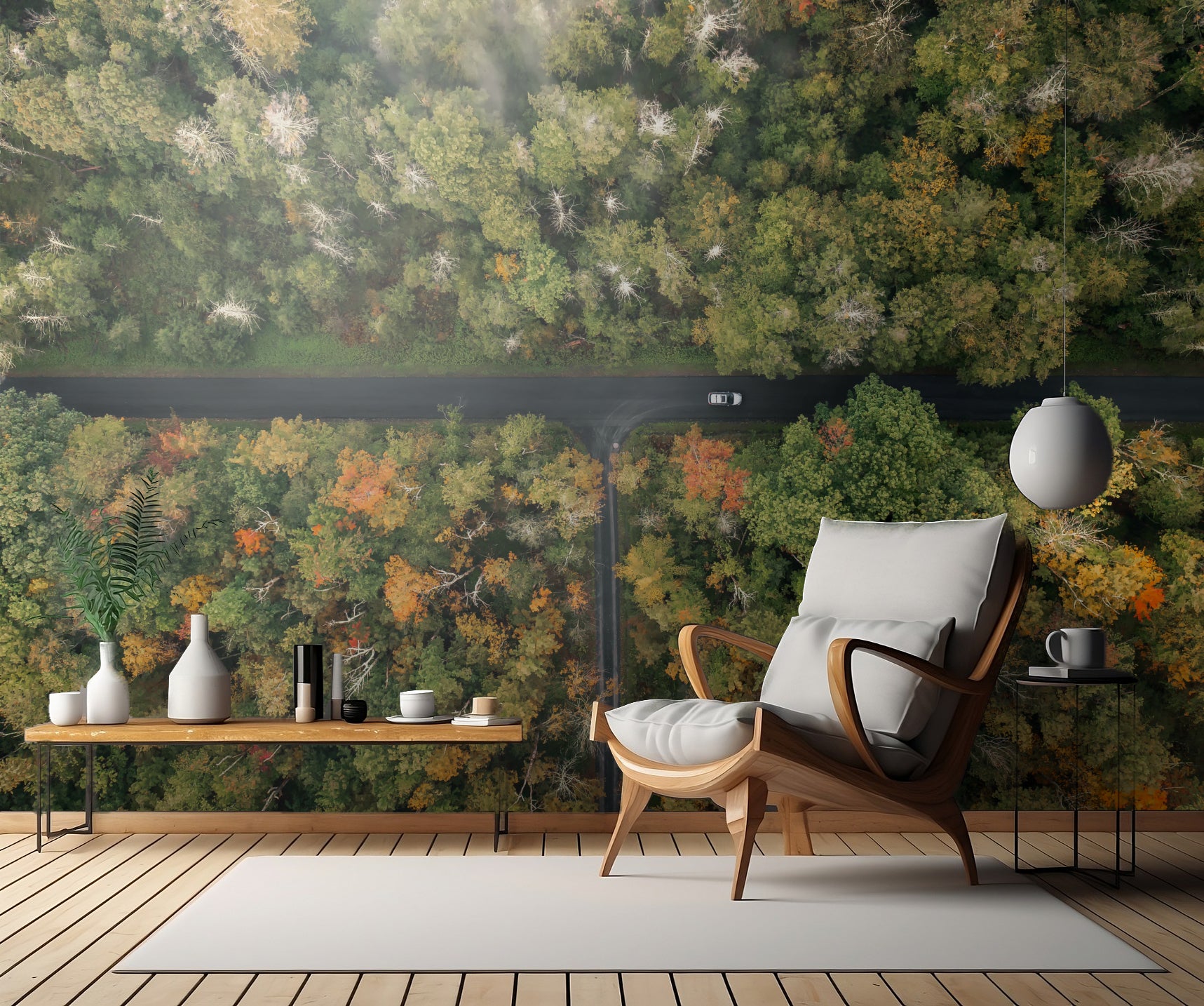 Denna tapet är perfekt för dig som längtar efter att förvandla ditt rum till en oas av lugn och reflektion. Låt skogen och vägen ta dig med på en resa där du känner vinden i håret och den mysiga atmosfären av att köra genom skogarna.