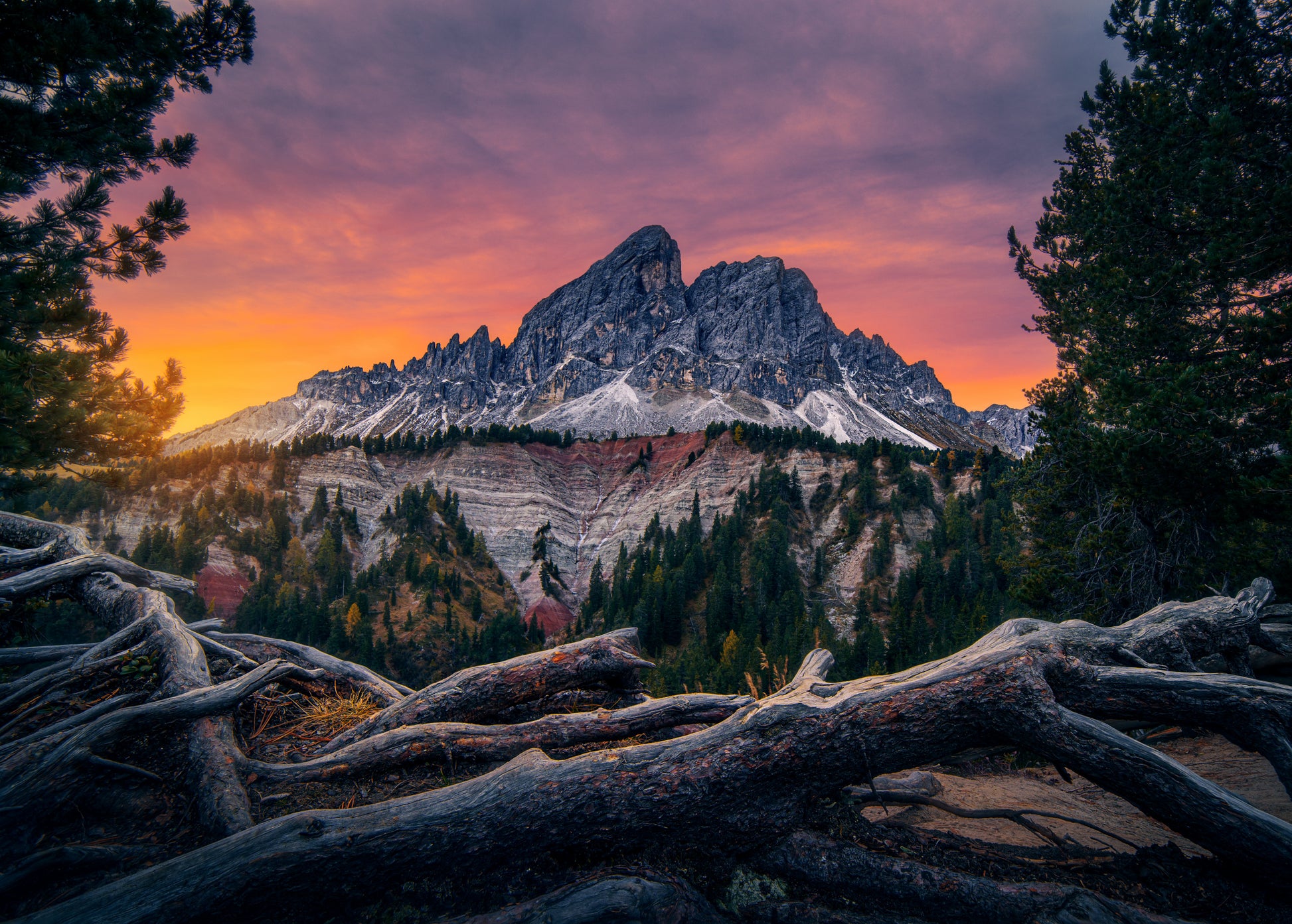 Välkommen till en värld av naturlig skönhet med väggtapeten "Würzjoch", designad av Jan Ilkovic. Denna tapet fångar den tidiga morgonens magi när solen sakta stiger över de majestätiska bergen. Med ett landskap fyllt av rötter, grenar och träd skapar denna tapet en känsla av stadig vördnad för naturen.