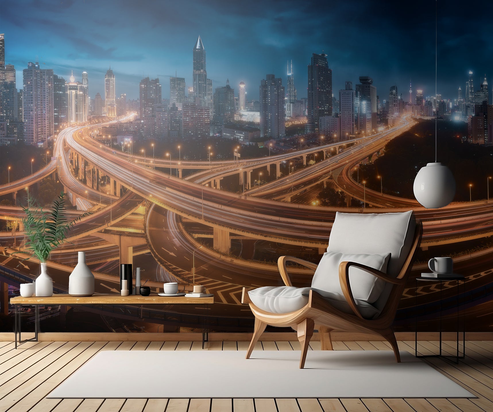 Denna tapet tar innehåll till ditt rum som du aldrig tidigare trott var möjligt. Med sina nattliga toner kombinerat med spektakulära skyskrapor, gator och korsningar skapas en verkligt unik upplevelse på din vägg. Färdas längs moderna vägar och motorvägar, centralt belägna i stadens mest imponerande kluster av byggnader.