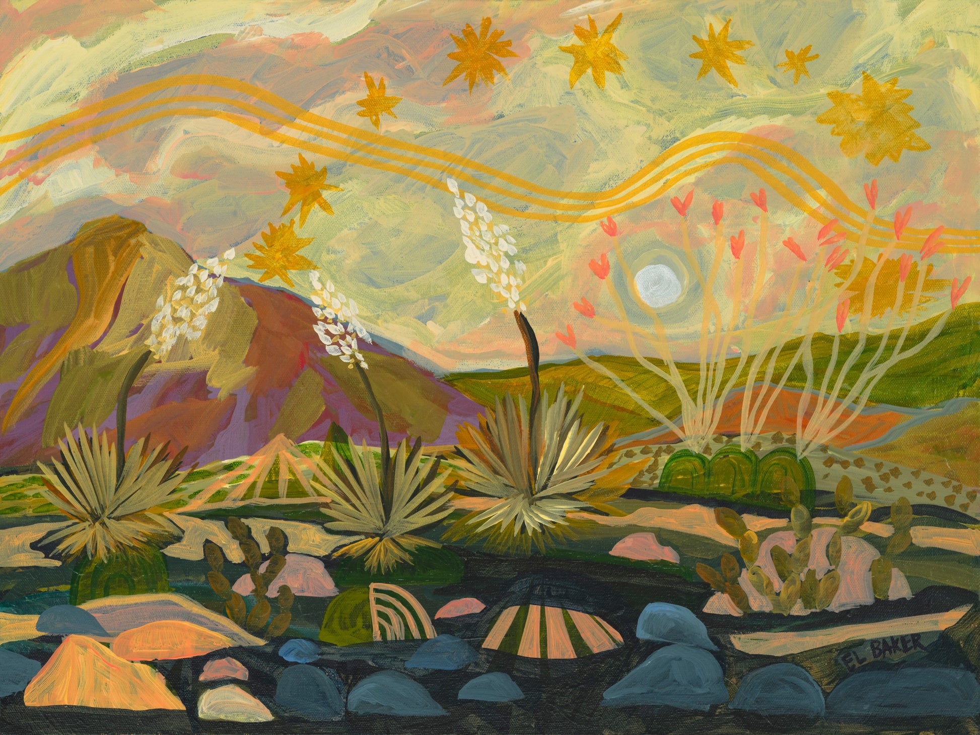 "Denna tapet passar perfekt för den som vill addera en touch av konstnärlighet och natur till sitt hem. Med dess unika illustrativa stil och skickliga handlag av Eleanor Baker kommer den garanterat att bli ett vackert samtalsämne i ditt hem. Skapa en ljus och lycklig atmosfär med "Yellow Sky Print" som din nya väggdekor.