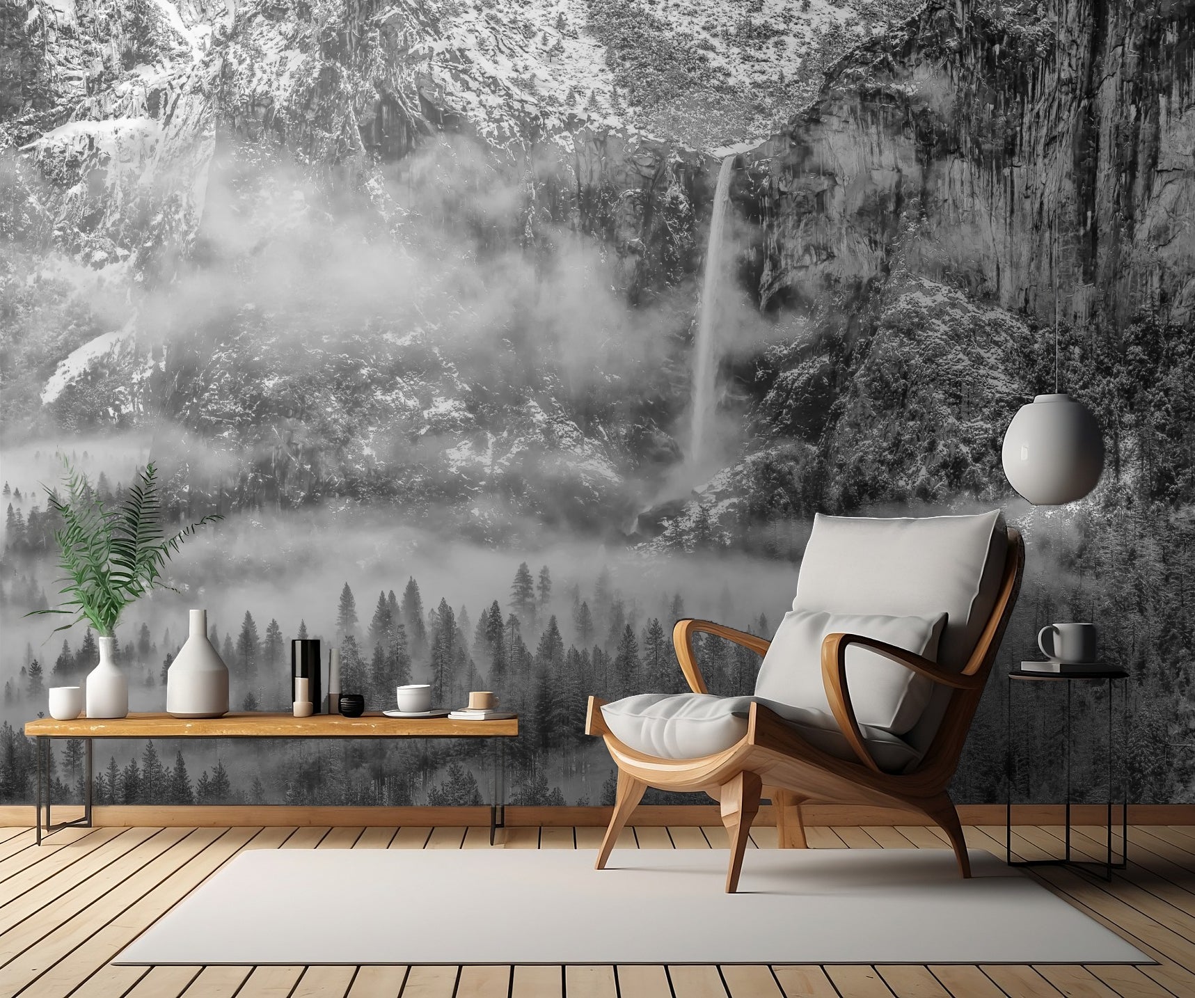 Så ta med dig naturen in i ditt hem och skapa en avkopplande atmosfär med vår exklusiva väggtapet "Yosemite after snow". Upplev kraften hos denna fantastiska vattenfall och njut av skönheten i denna dimmiga, svartvita landskap. Ge ditt rum en frisk känsla av mystik med denna unika tapet designad av Ning Lin.