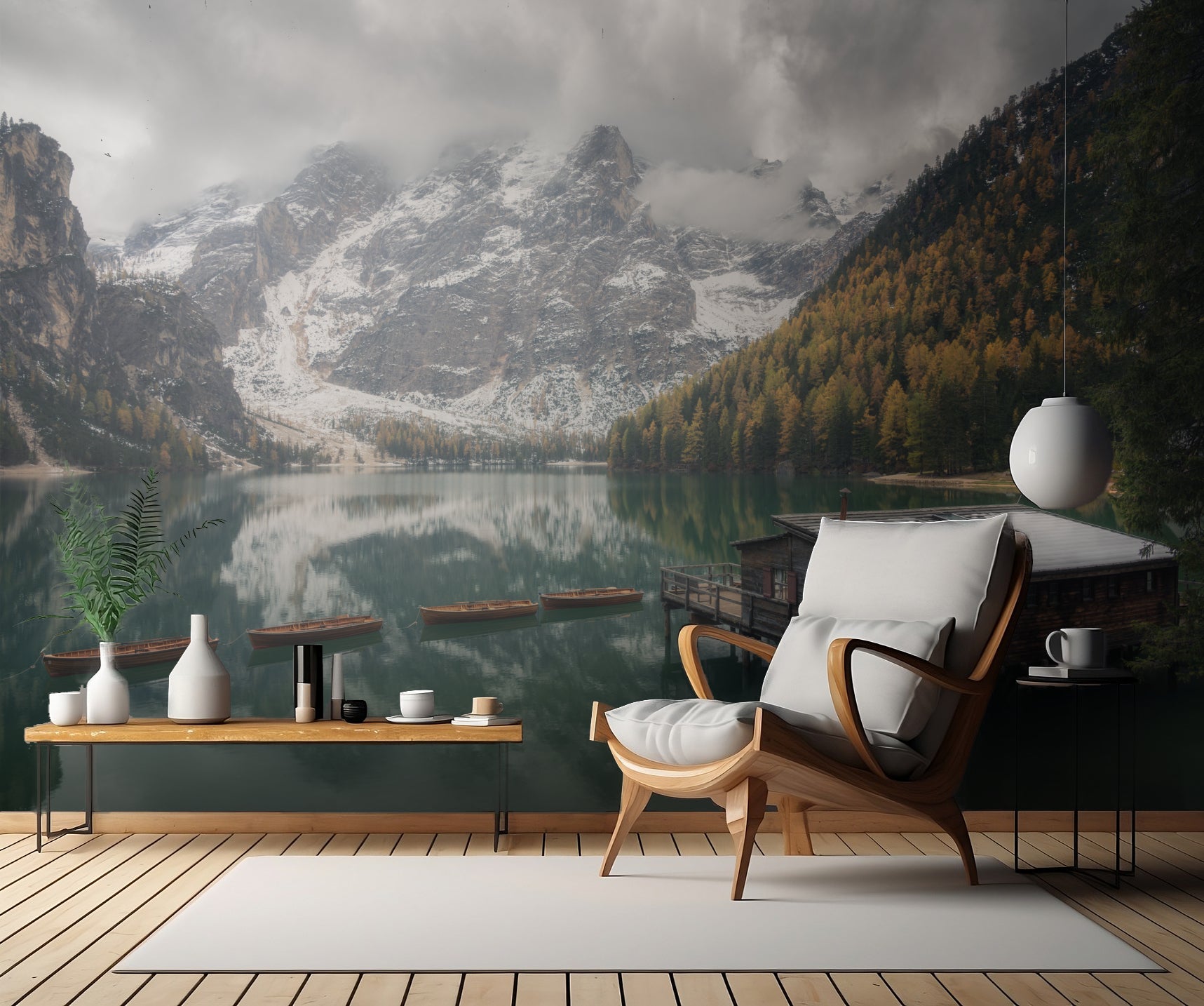 Fånga känslan av lugn och frihet med väggtapeten "You Better Breathe While There’s Still Time" skapad av Thomas de Franzoni. Denna vackra tapet visar en idyllisk landskapsvy med en lugn sjö, omringad av majestätiska bergstoppar. En båt ligger förtöjd vid en pittoresk båthus, och i fjärran syns en charmig stuga.