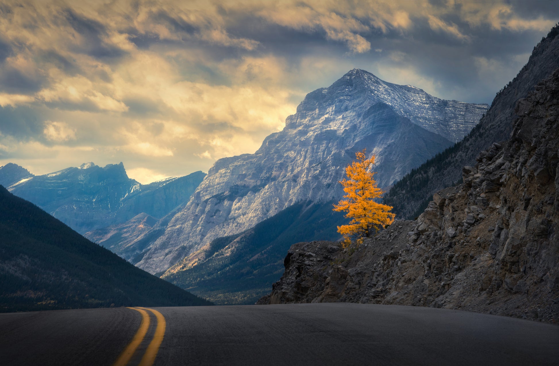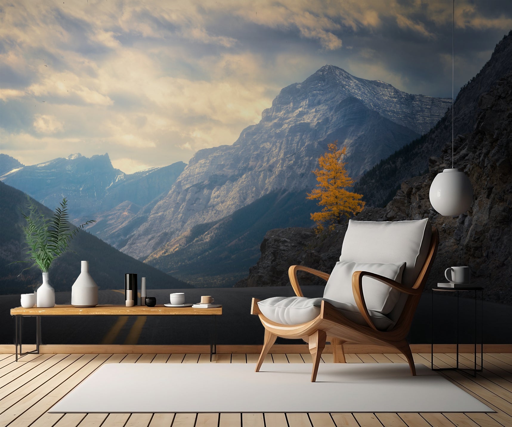 Ensamheten som ett träd i landskapet förmedlar tillsammans med det färgsprakande fallet gör denna tapet till en fantastiskt vacker representation av höstens skönhet. De proportioner (ratio_15) som används ger oss även en brett och panoramisk känsla där vi kan låta ögonen svepa över den dramatiska horisonten med berg, himmel och moln.